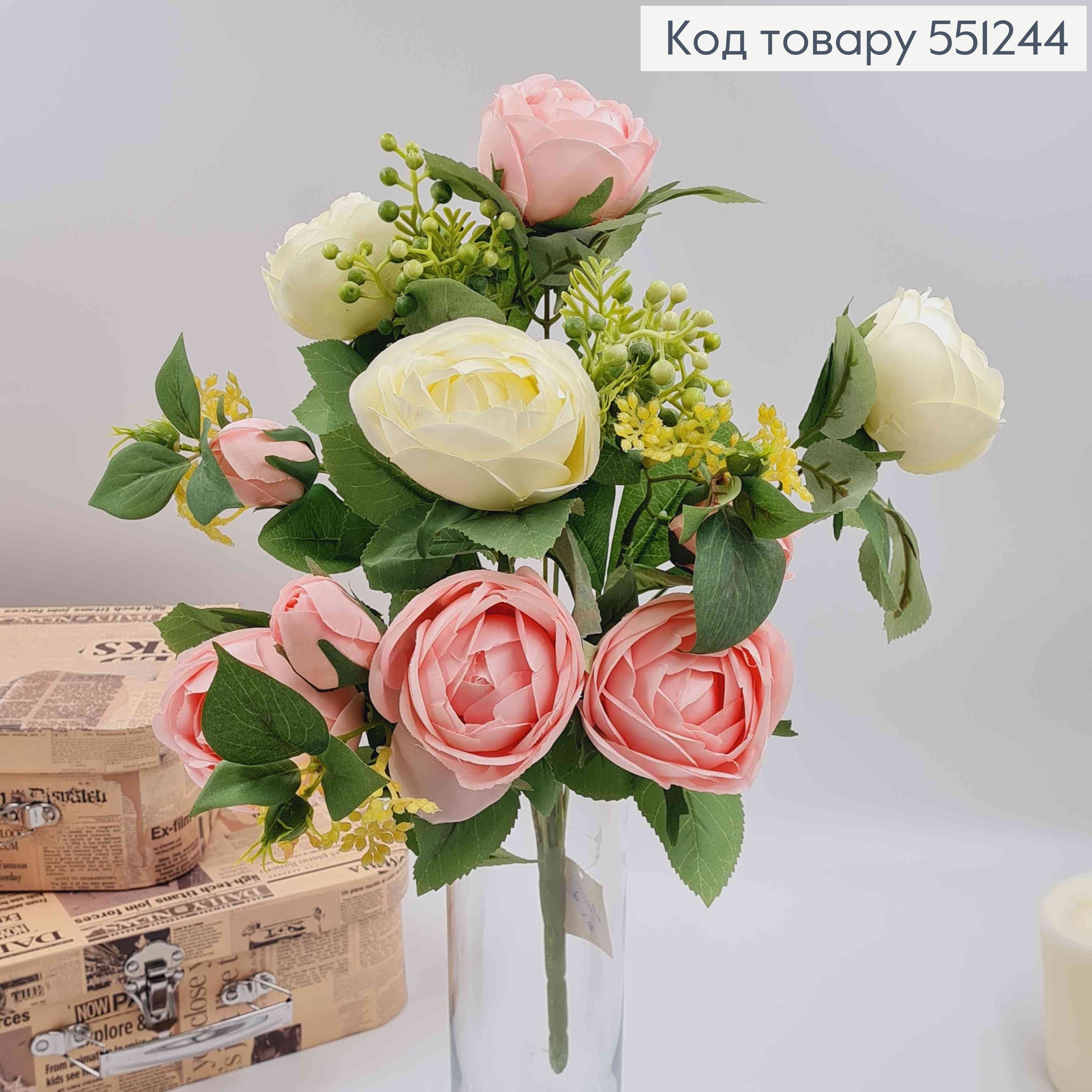 Композиция "Букет БЕЛЫЕ и РОЗОВЫЕ розы Камелия с зеленым декором", высотой 46см