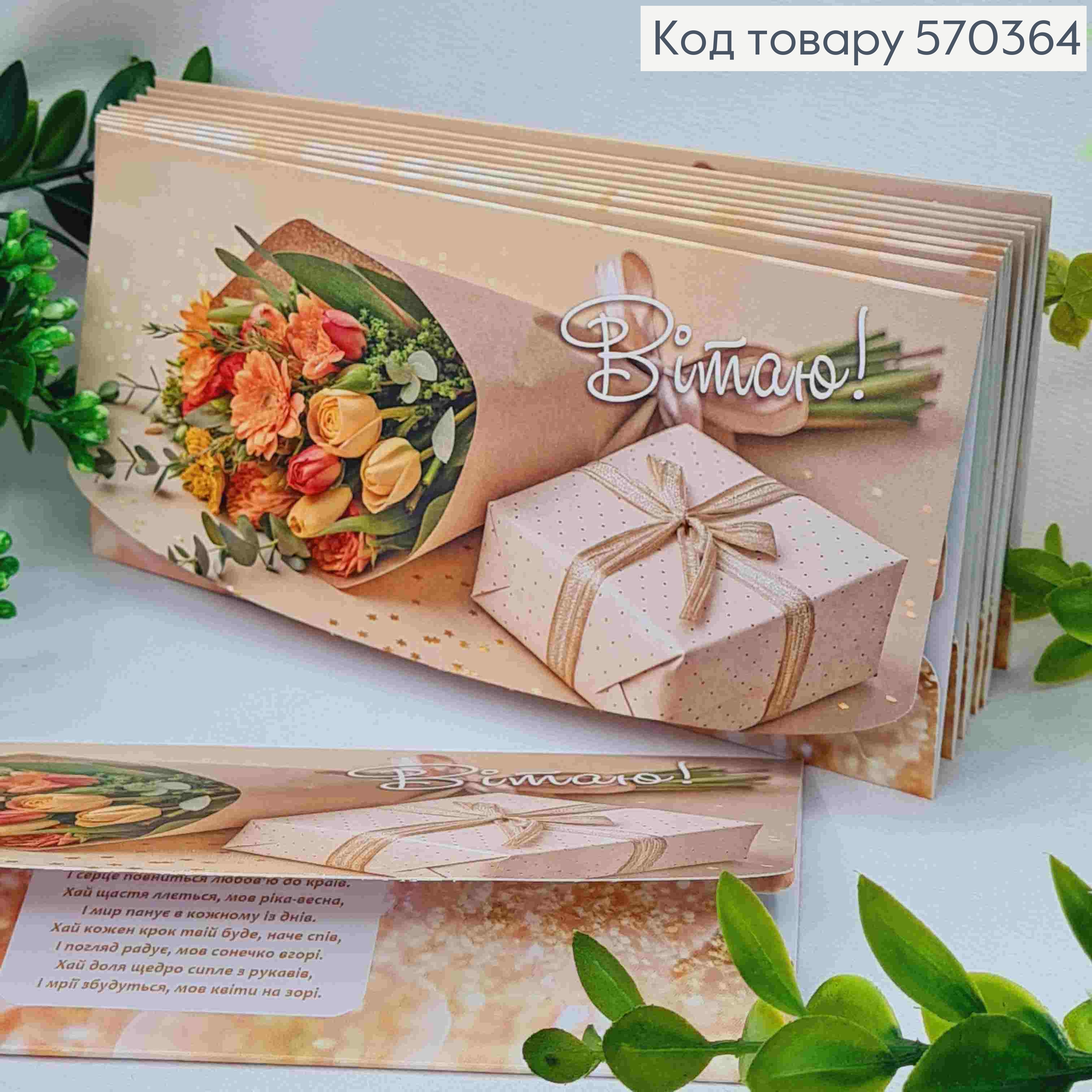 Конверт "Пздравляю!", с цветами и подарком, 17*8см, 10шт\уп