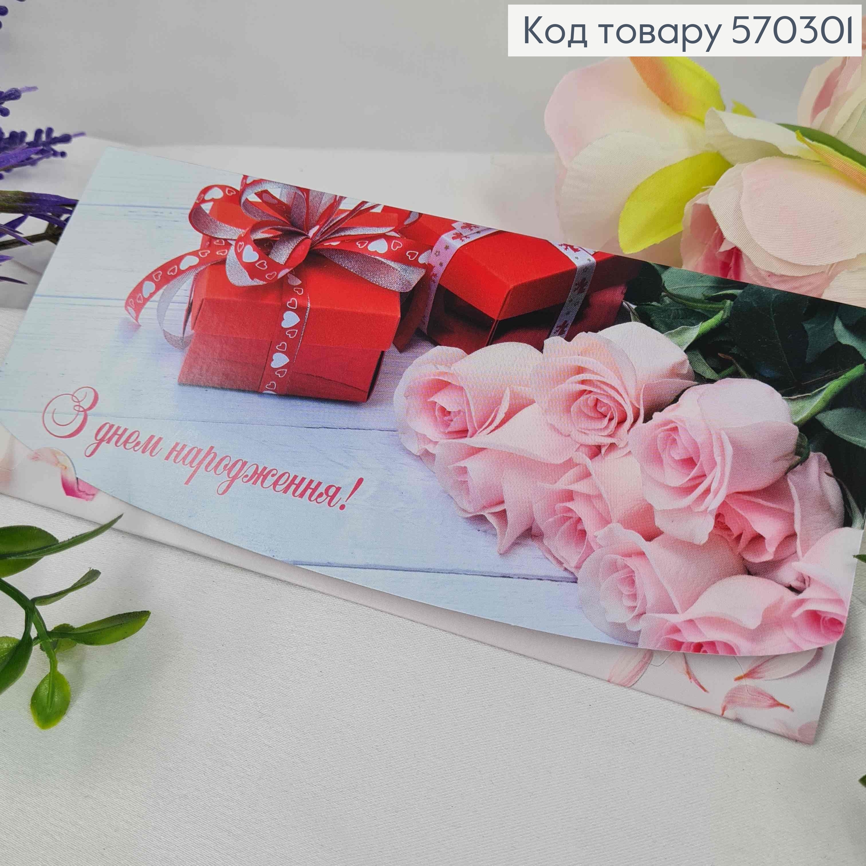Конверт "С Днем Рождения!", с розовыми розами, 17*8см, 10шт\уп