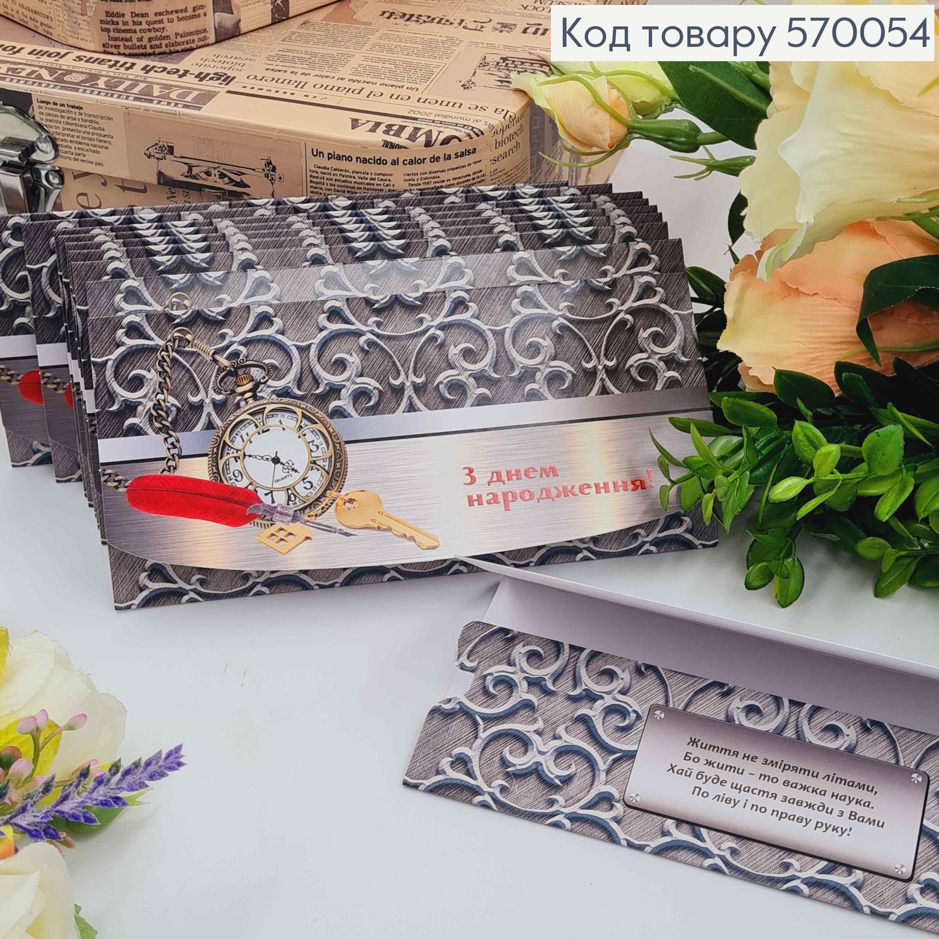 Конверт "С Днем рождения", С вензелями, Часами и пером, 17*8см, 10шт\уп
