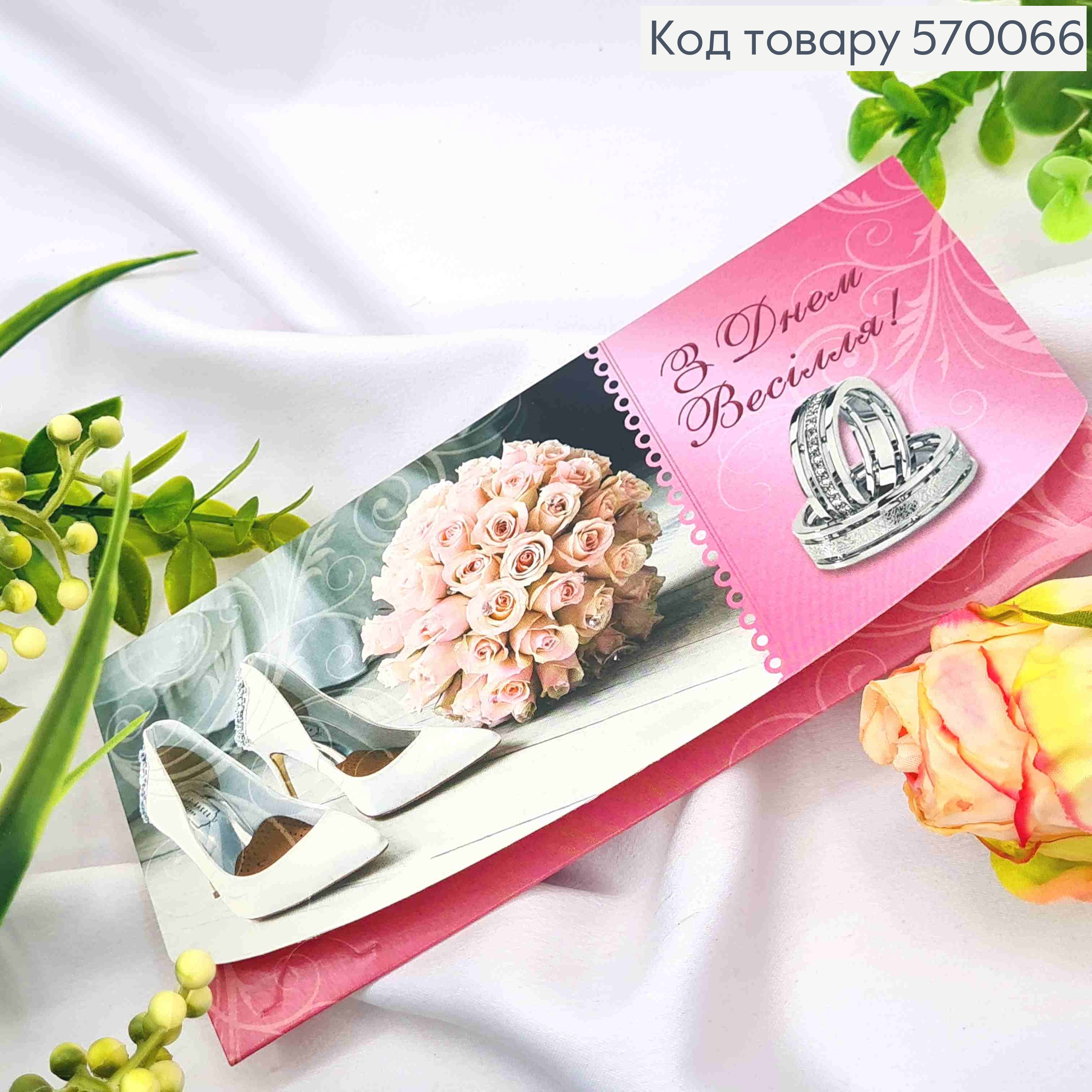 Конверт "С днем Свадьбы" с туфельками, букетом и колечками, 17*8см 10шт/уп
