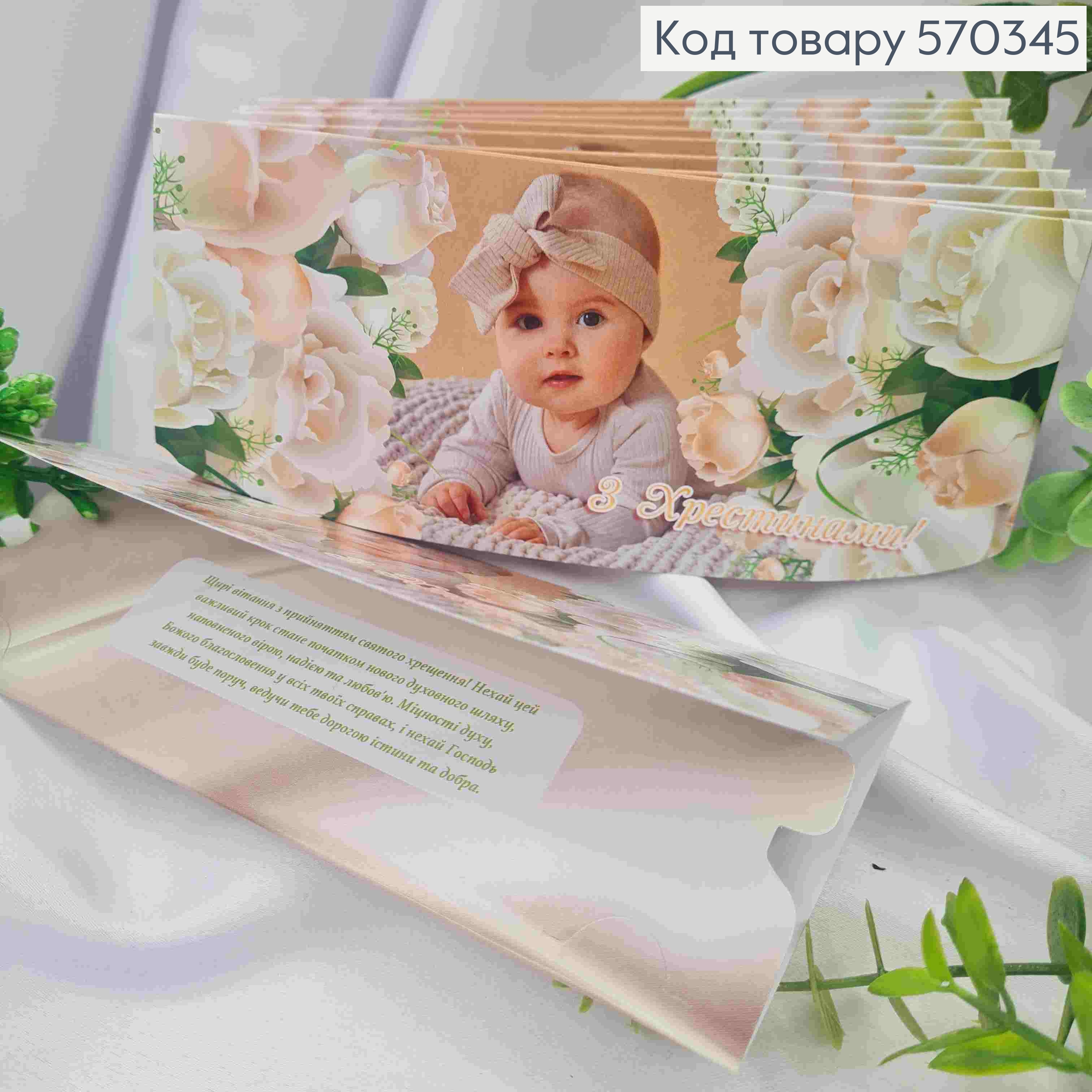 Конверт "С Крестинами!", с малышом и цветами, 17*8см, 10шт\уп