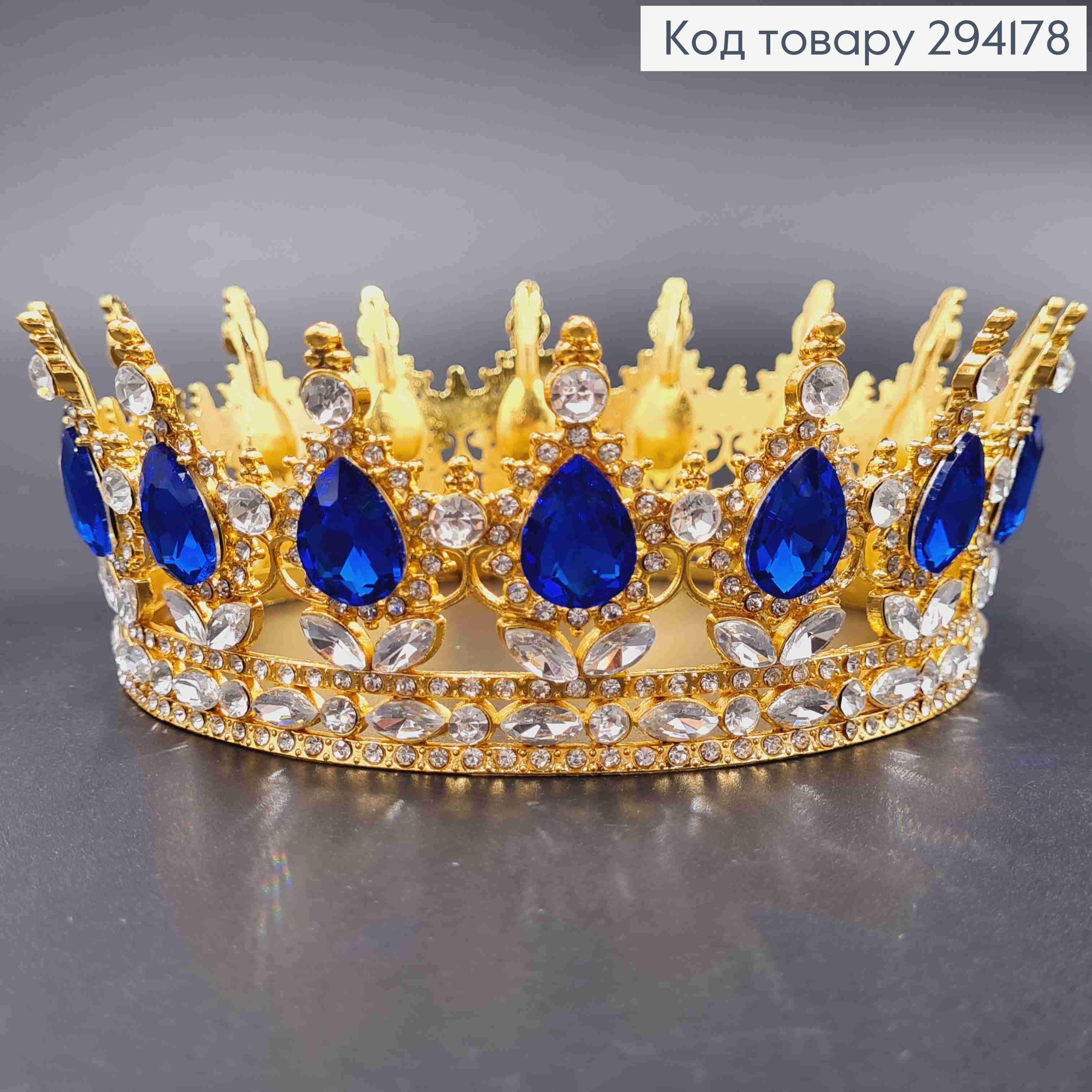 Корона под Золото, "Королевская" с СИНИМИ камушками, диаметр 8см, высота 4,5см (можно на торт) 294185 фото