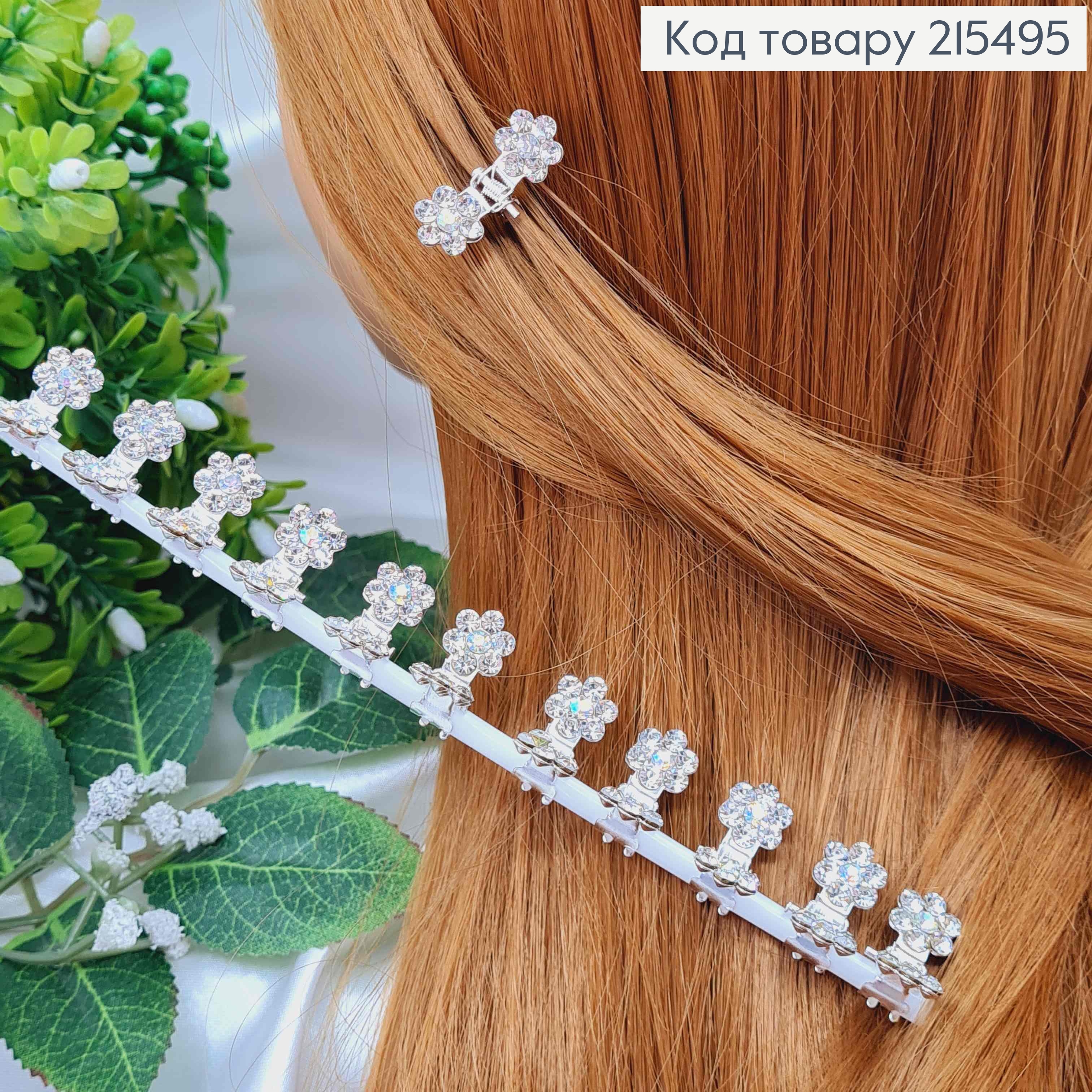 Крабик маленький, с двумя цветочками в камешках, 1.5 см, металл, серебряный цвет, 12 шт/уп.