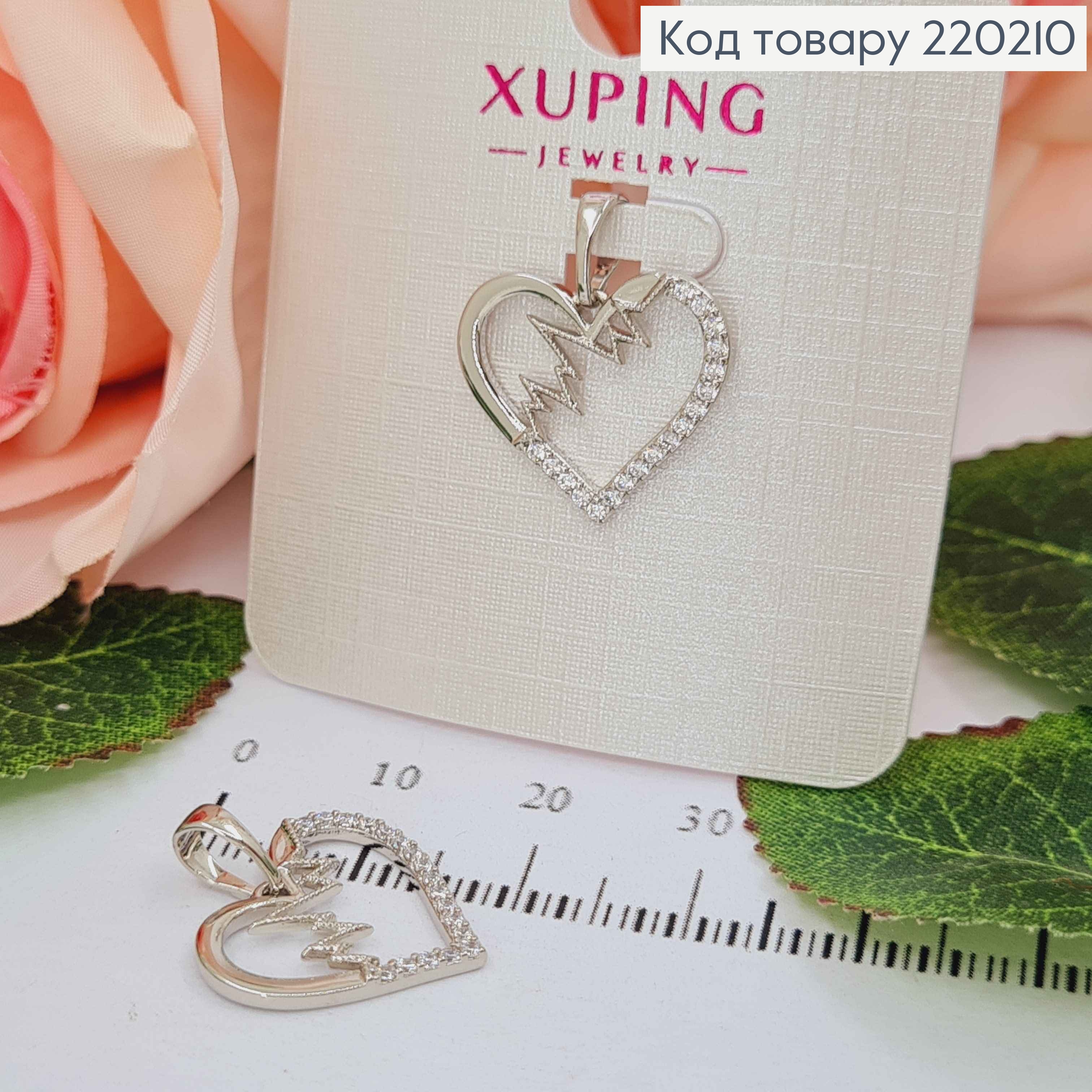 Кулон родованный, Сердце с пульсом, в камнях, 1,7см, Xuping