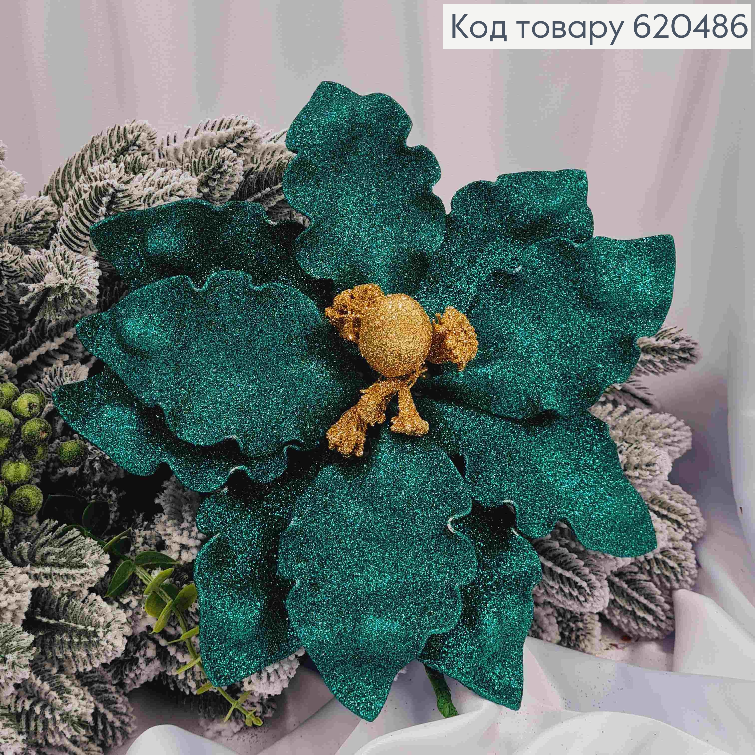 "Рождественник", цветок Пуансетия ИЗУМРУДНАЯ+БЛЕСК, бархатная, диам. 20см на металл., дл.22см 620769 фото