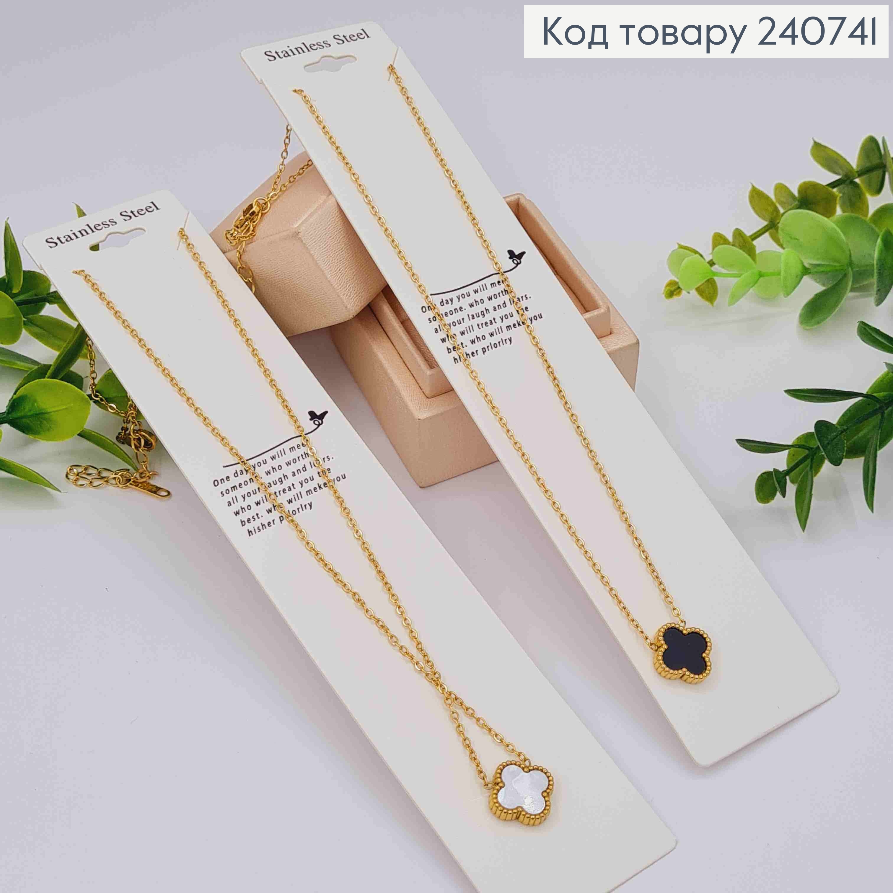 Цепочка серебряного цвета, с подвеской Van Cleef с перламутровой эмалью, 44+5см сталь Stainless Steel 240756 фото