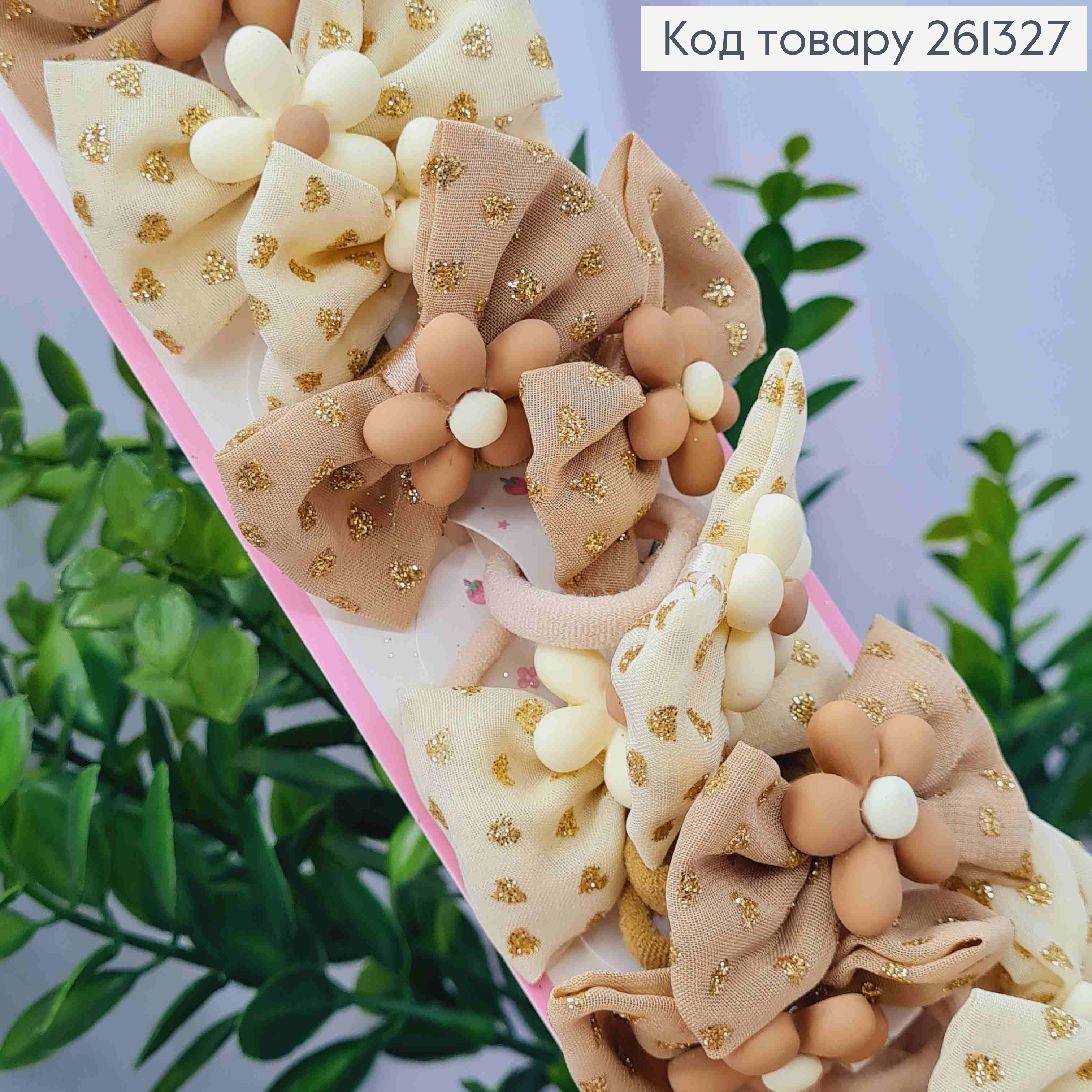 Набор резинок (20шт), БАНТИК + ЦВЕТОК с блеском, Бежевые цвета, резинка 3см, бантик 6*3,5см