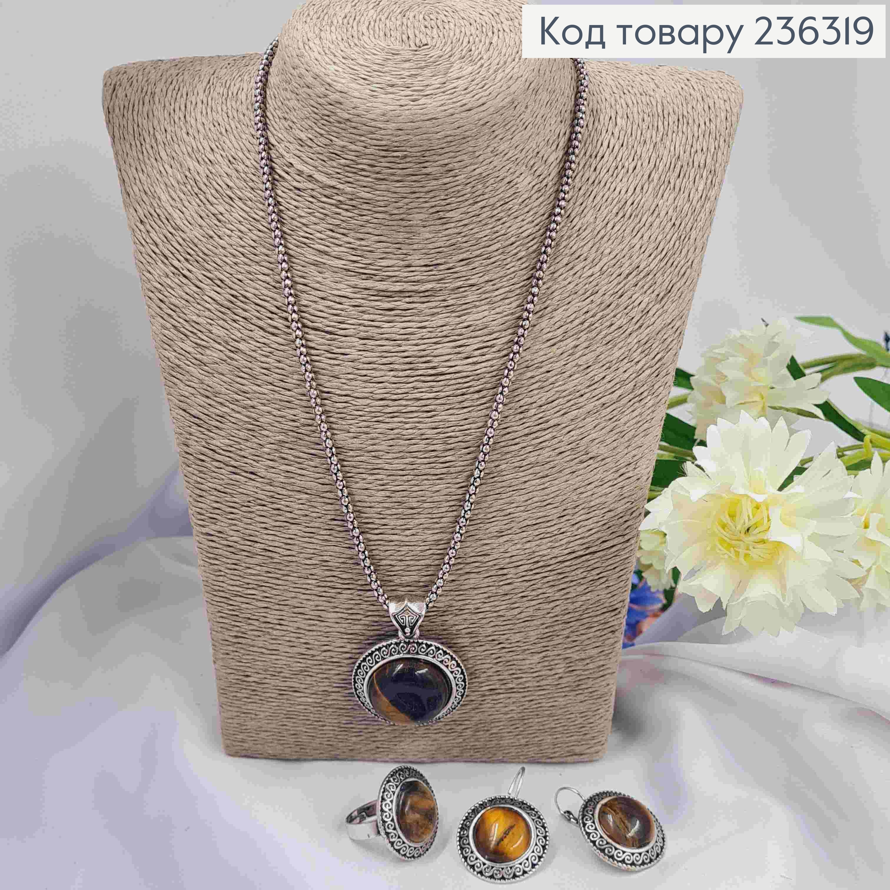 Набор Серьги (франц. зам.), колечко(19р) с регуляцией и подвеска 45+5см, с Тигровым глазом