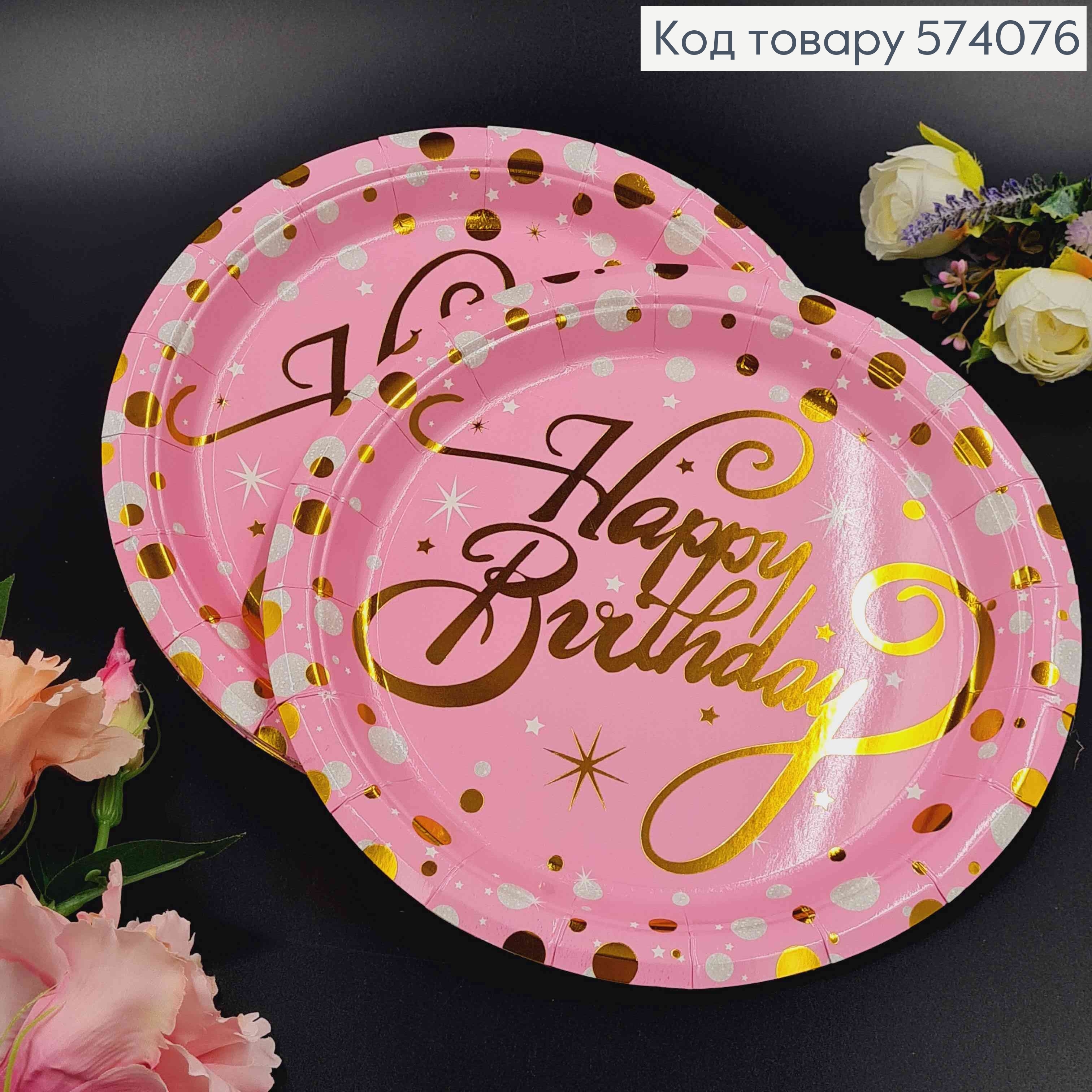 Набор бумажных тарелок с надписью "Happy Birthday" Розовым-Золотом на Белом фоне, 10шт/уп, 18см. 574140 фото