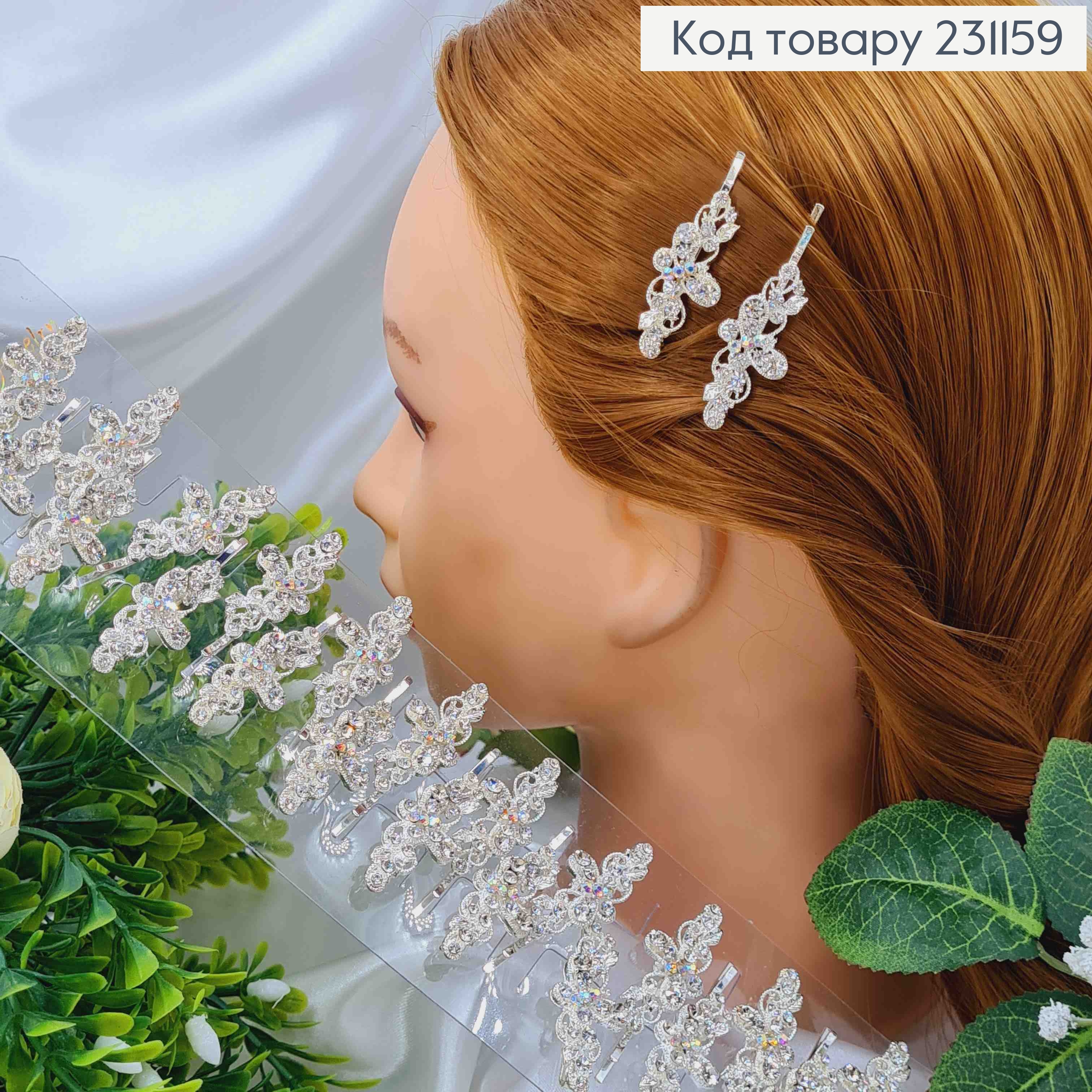 Набор невидимок (12шт), "Цветок с Бабочкой" с Блестящими камешками, 5см, Серебряного цвета 231187 фото
