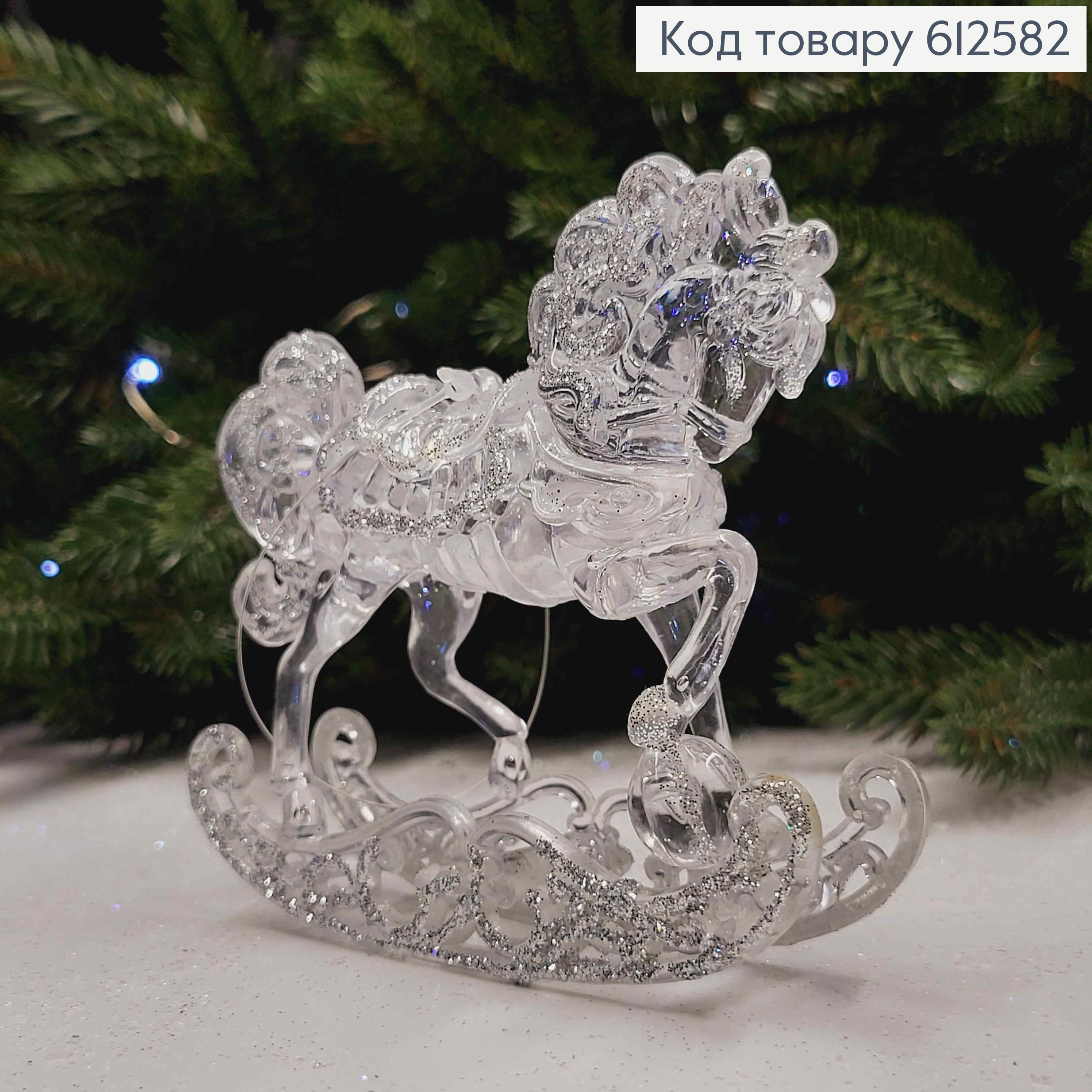 Новогодняя фигура КОНЬ НА САНЯХ, цвет ПРОЗРАЧНЫЙ+СЕРЕБРО, 10*9см, Украина