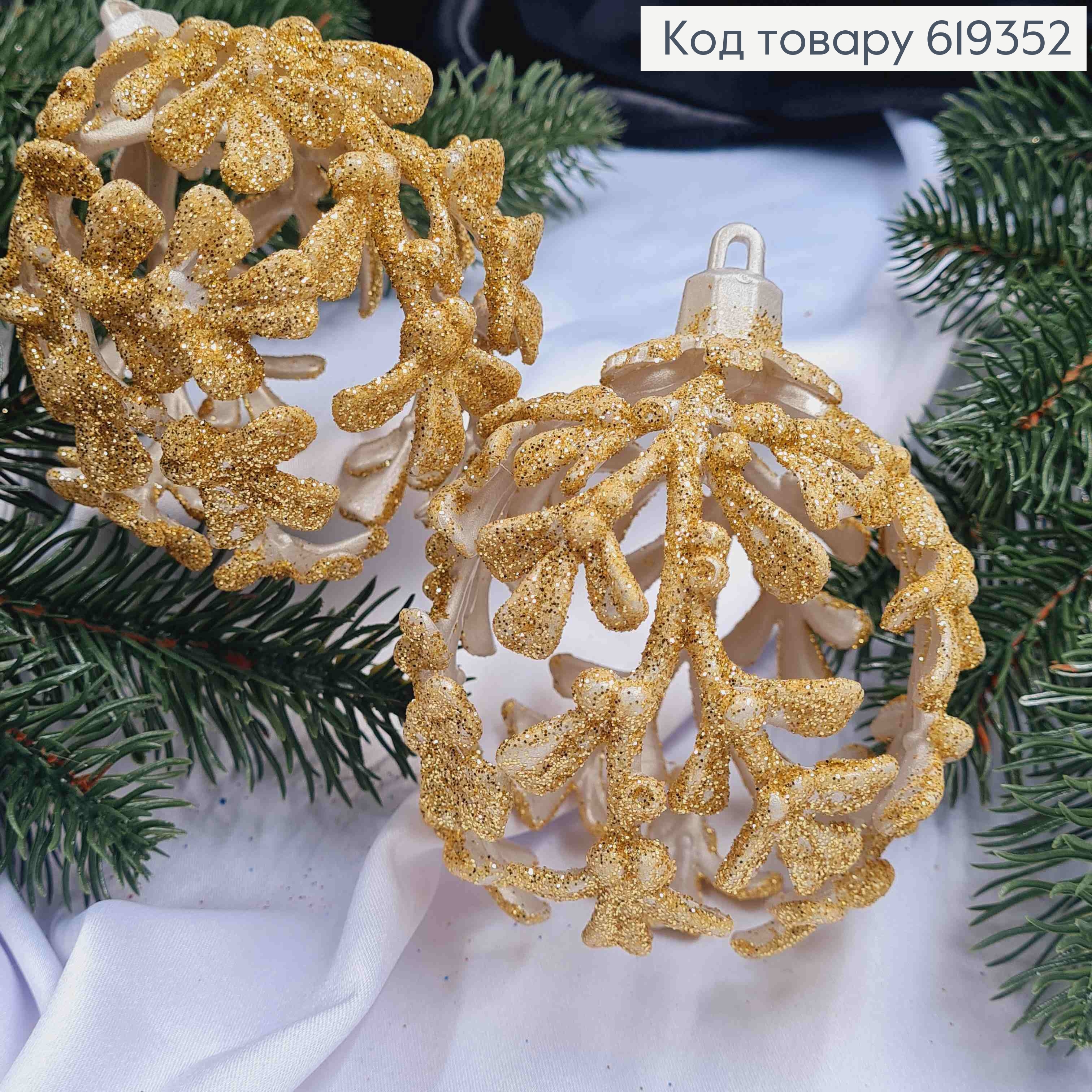 Новогодняя игрушка круглая "Веточка" шампань с блеском, пластиковая, диаметр 9см, Украина.