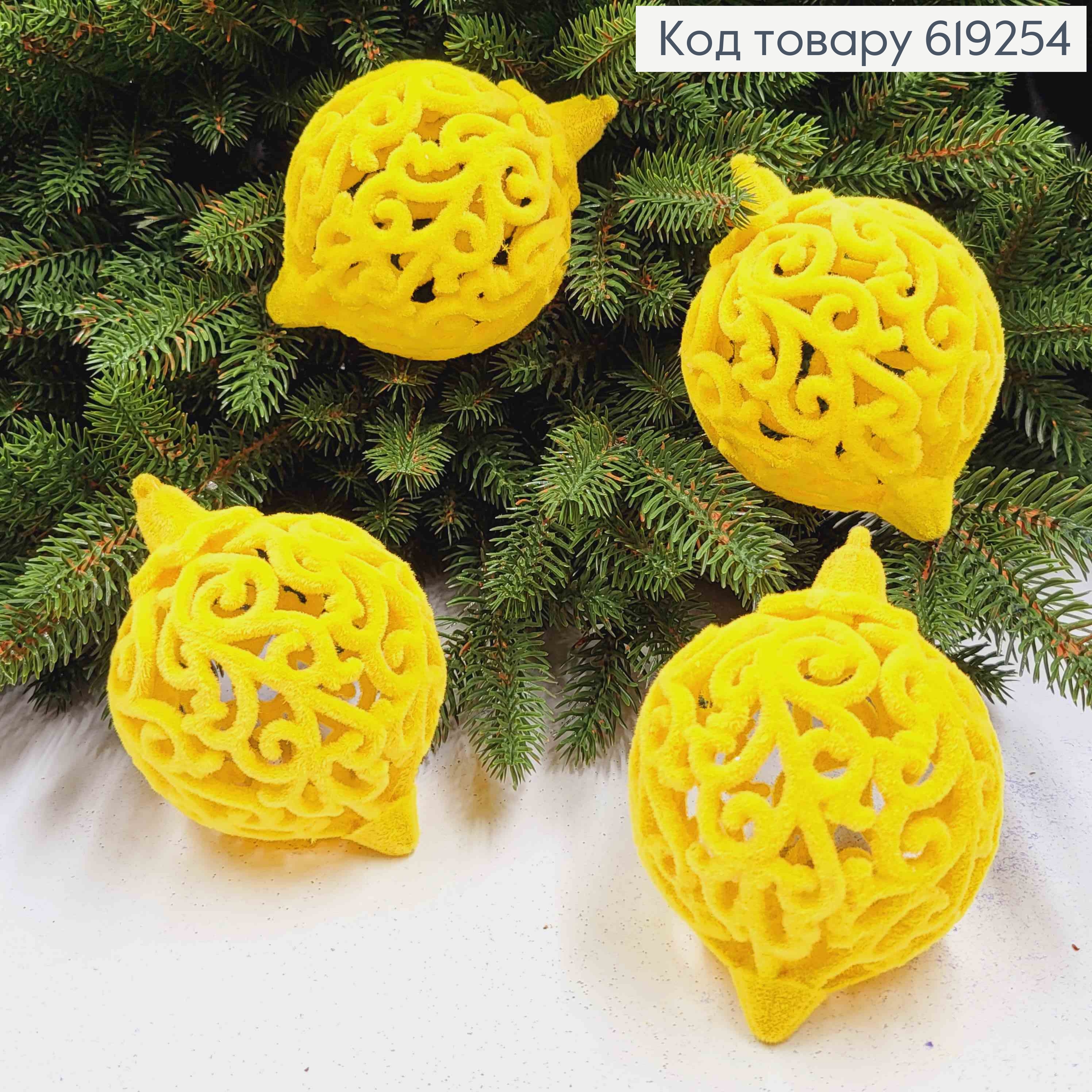 Новогодняя игрушка ВЕНЗЕЛЯ, дутая, бархат, цвет ЖЕЛТАЯ, диам.70мм, 4шт/уп, Украина
