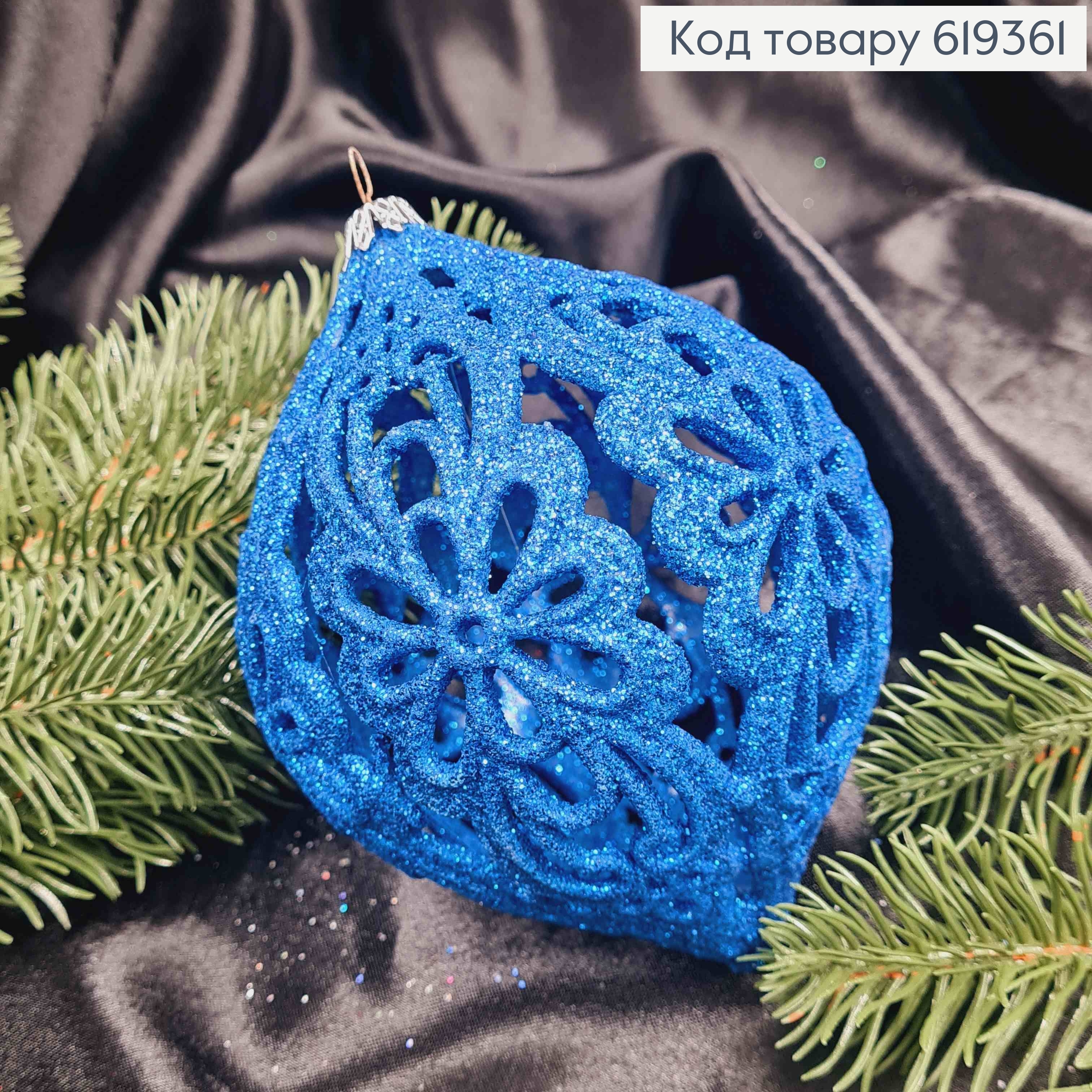 Новогодняя игрушка удлиненная "АЖУРНАЯ" СИНЯЯ с блеском, пластиковая, размер 14см, Украина