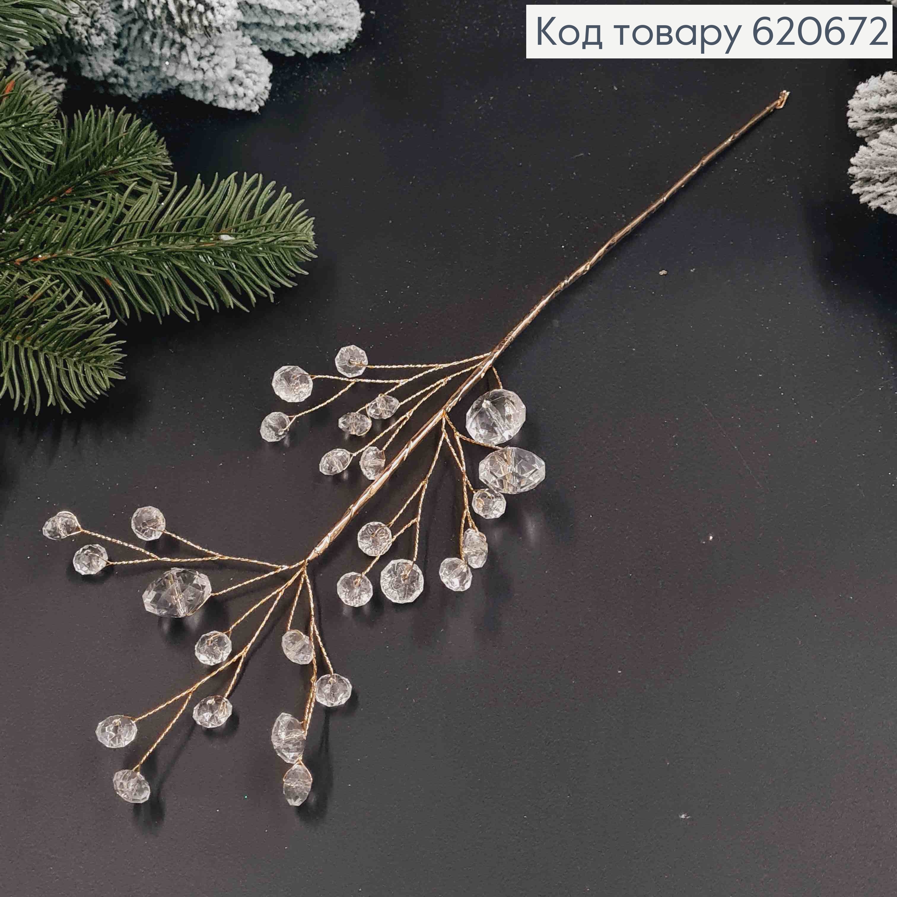 Новогодний декор веточка Золотая, с прозрачными камнями, на металл стержни, длина 34см.