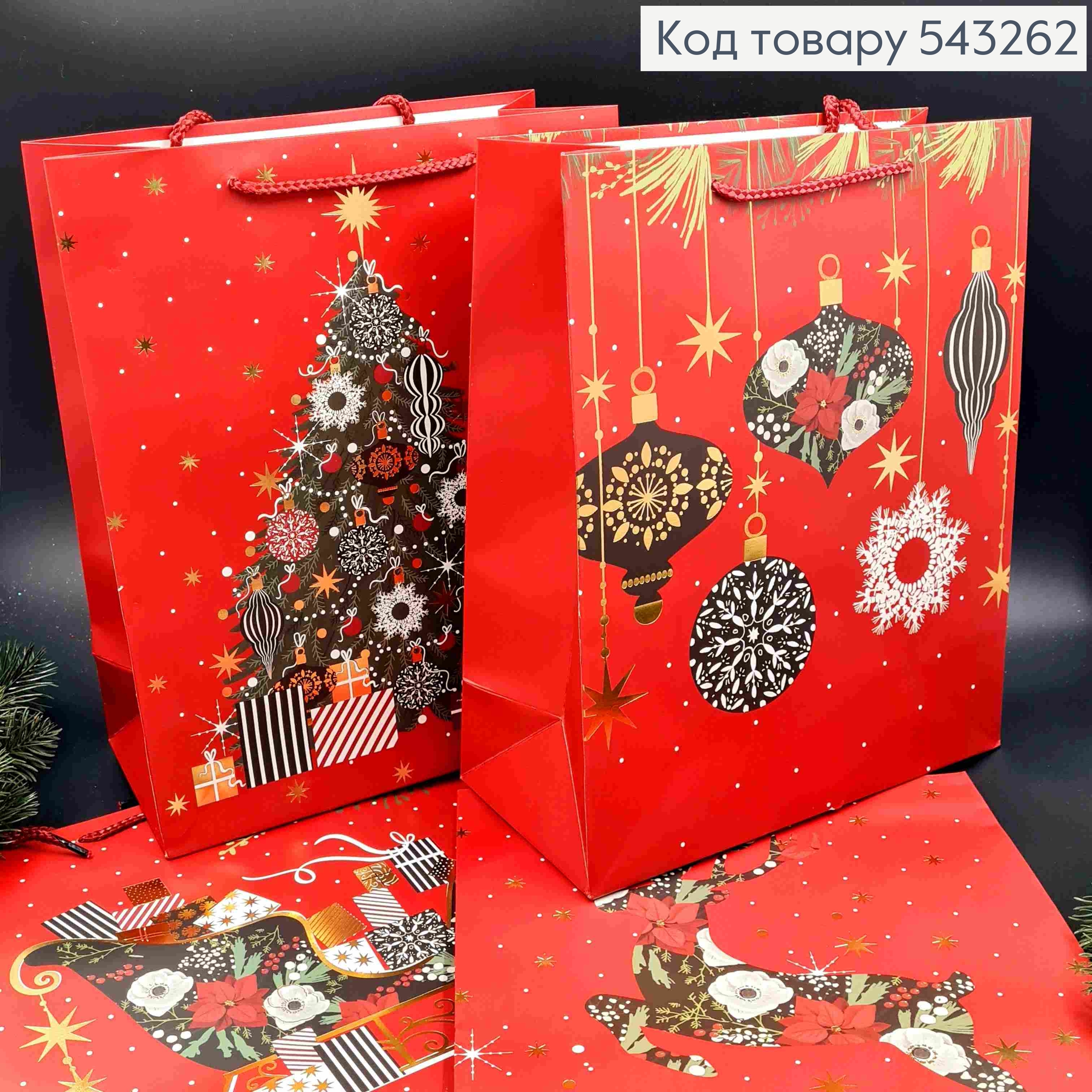 Пакет бумажный Красный с Новогодним принтом, 32*26*12, в ассортименте