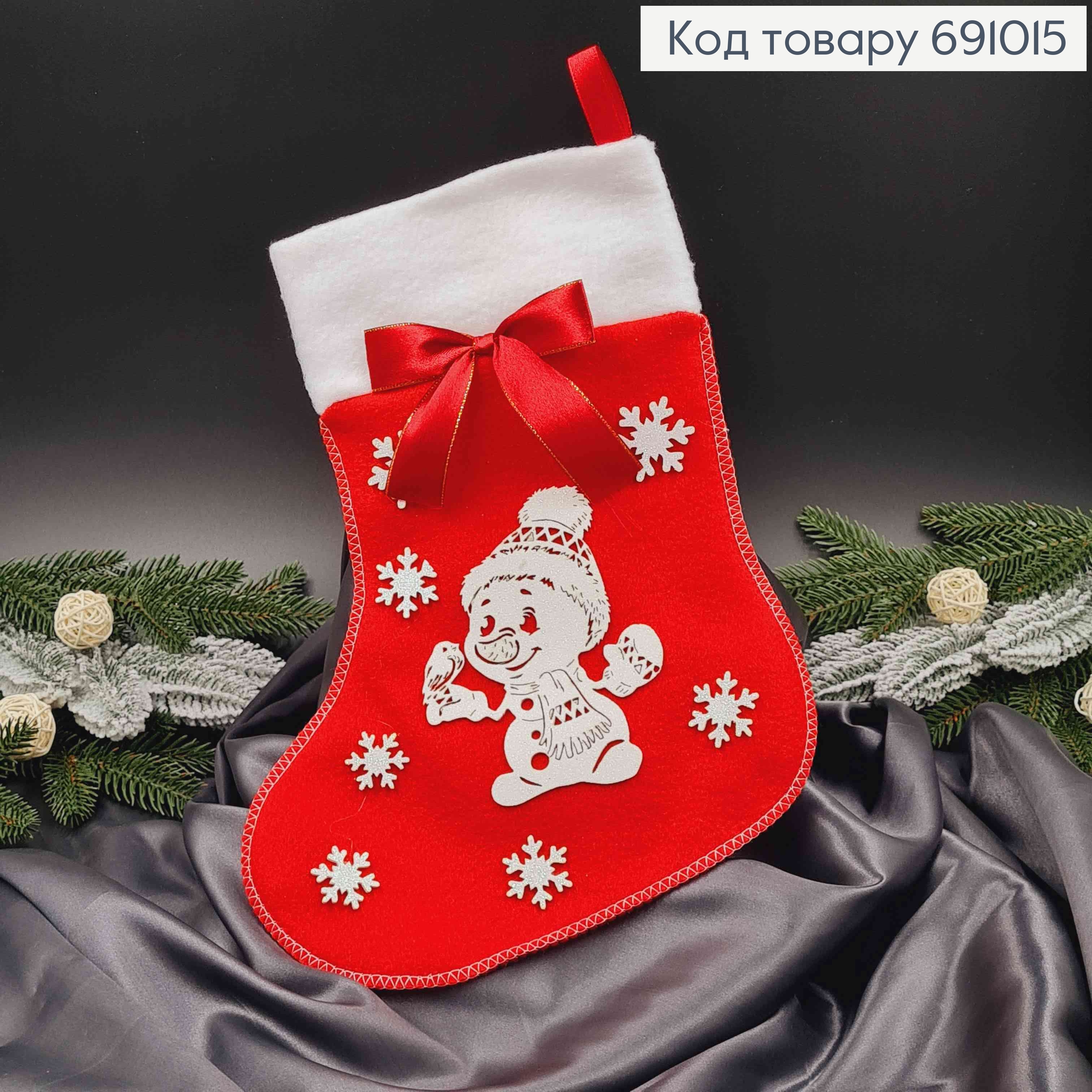 Чулок Рождественский, Красного цвета, с бантиком, блестящими снежинками и снеговичком 30*22см