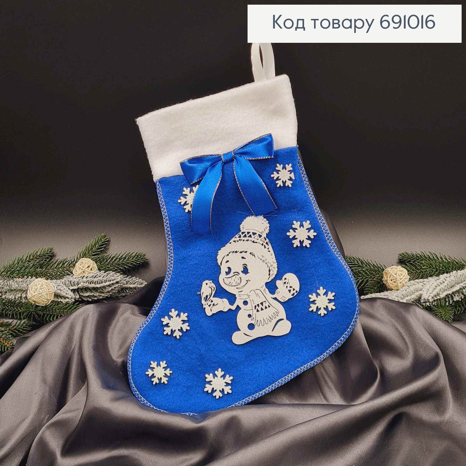 Чулок Рождественский, Синего цвета, с бантиком и блестящими снежинками и снеговичком, 30*22см 691011 фото