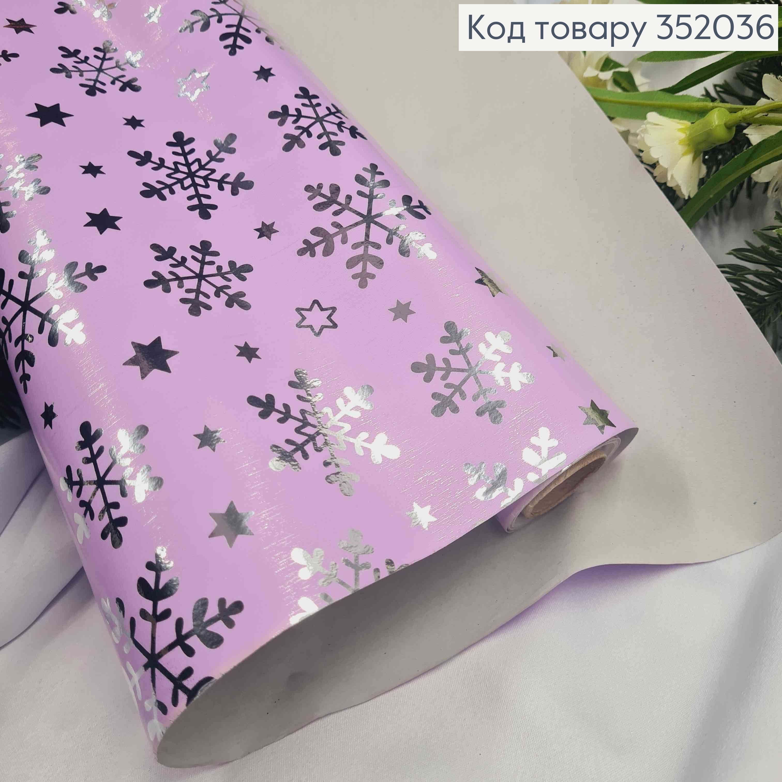Бумага Крафт новогодний "Серебряные снежинки" на Лавандовом, 70см, длина 7метров