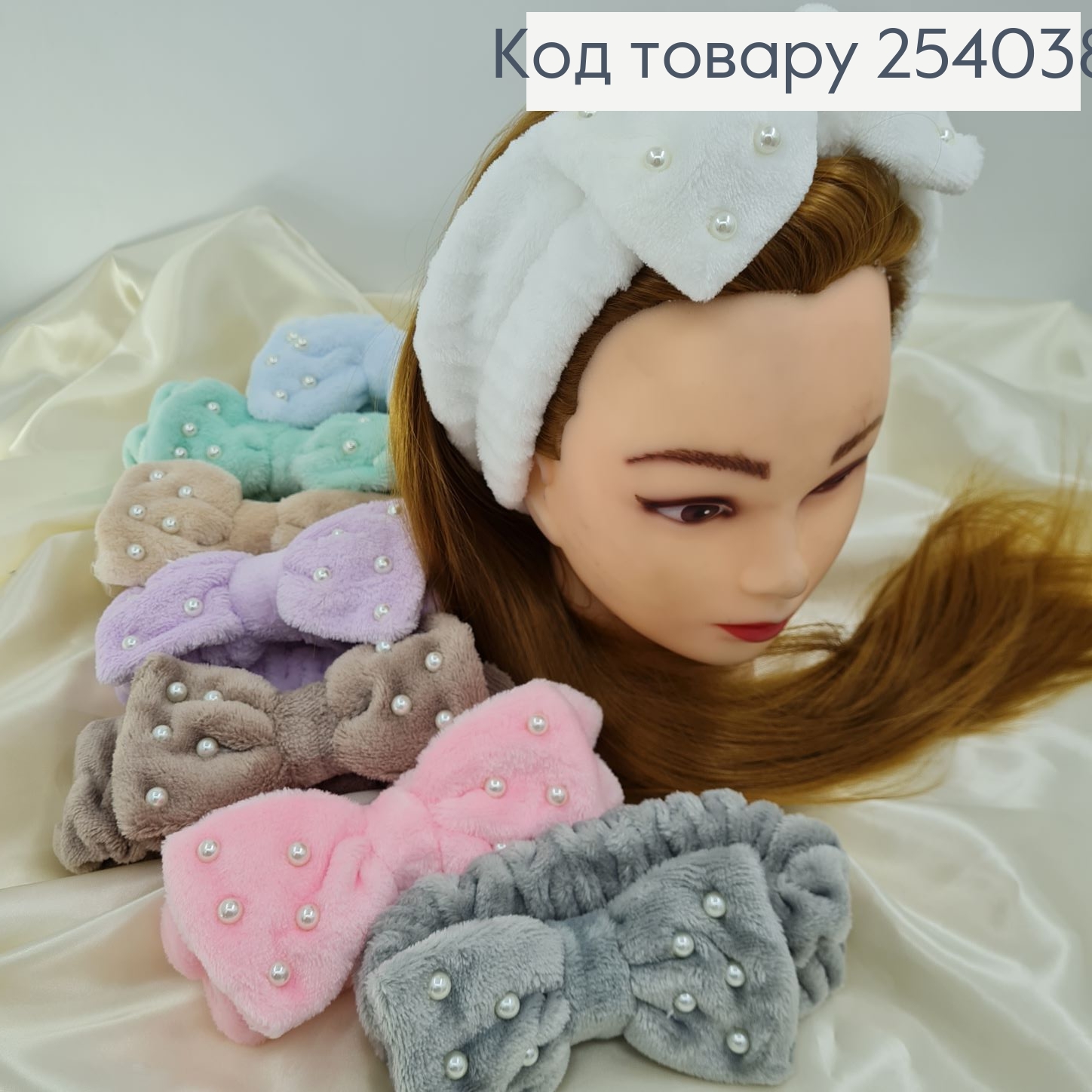Повязка махровая косметическая с бантиком и жемчужинами в ассорт.