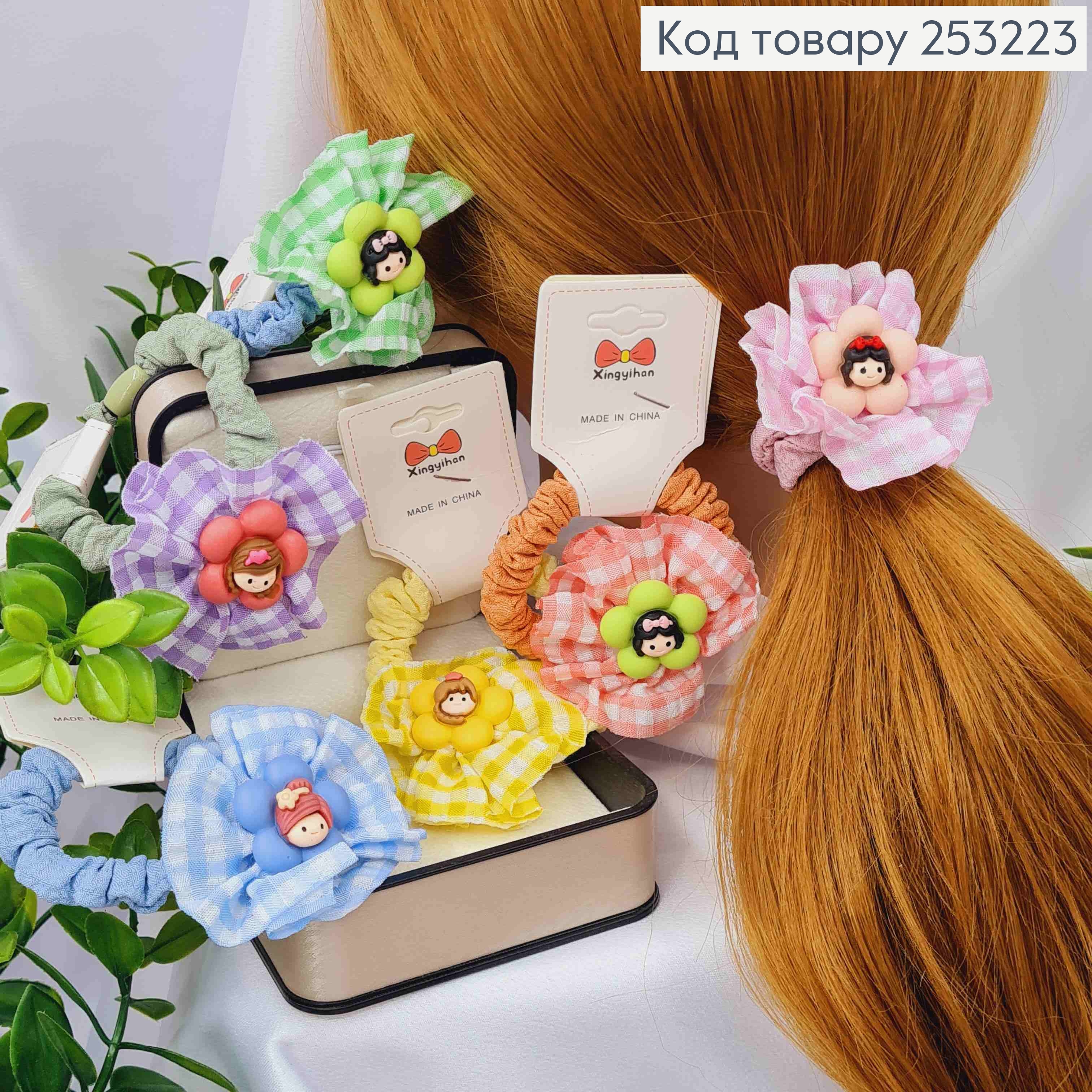 Резинка детская, жатка, с куклами на цветочке (6см), диаметр 6см, цвета в ассортименте