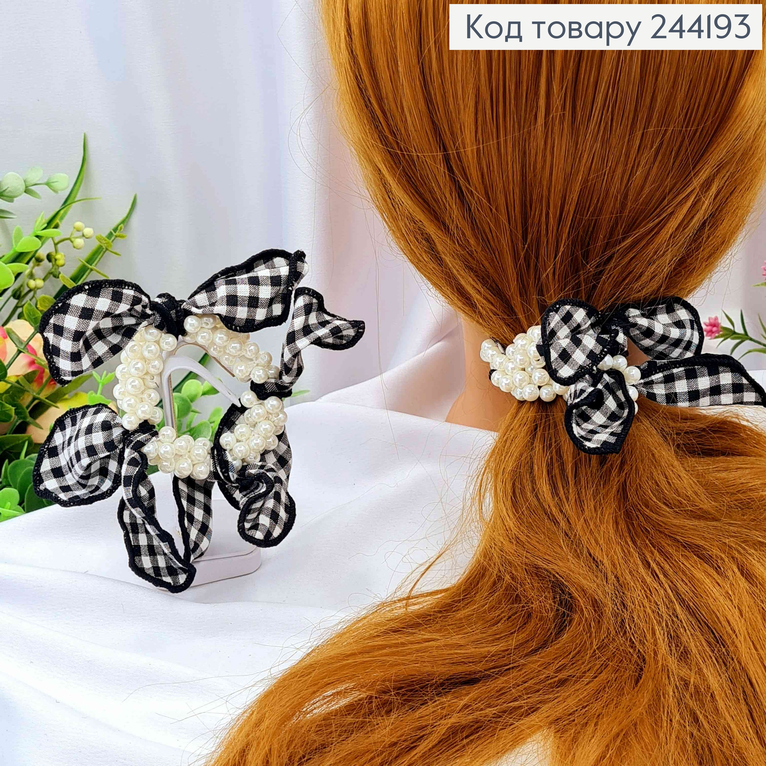 Резинка с брошью в Жемчужинах и Бантиком с люрексом, Цвета в ассорт., резинка 5,5см, бант 10*11см 253229 фото