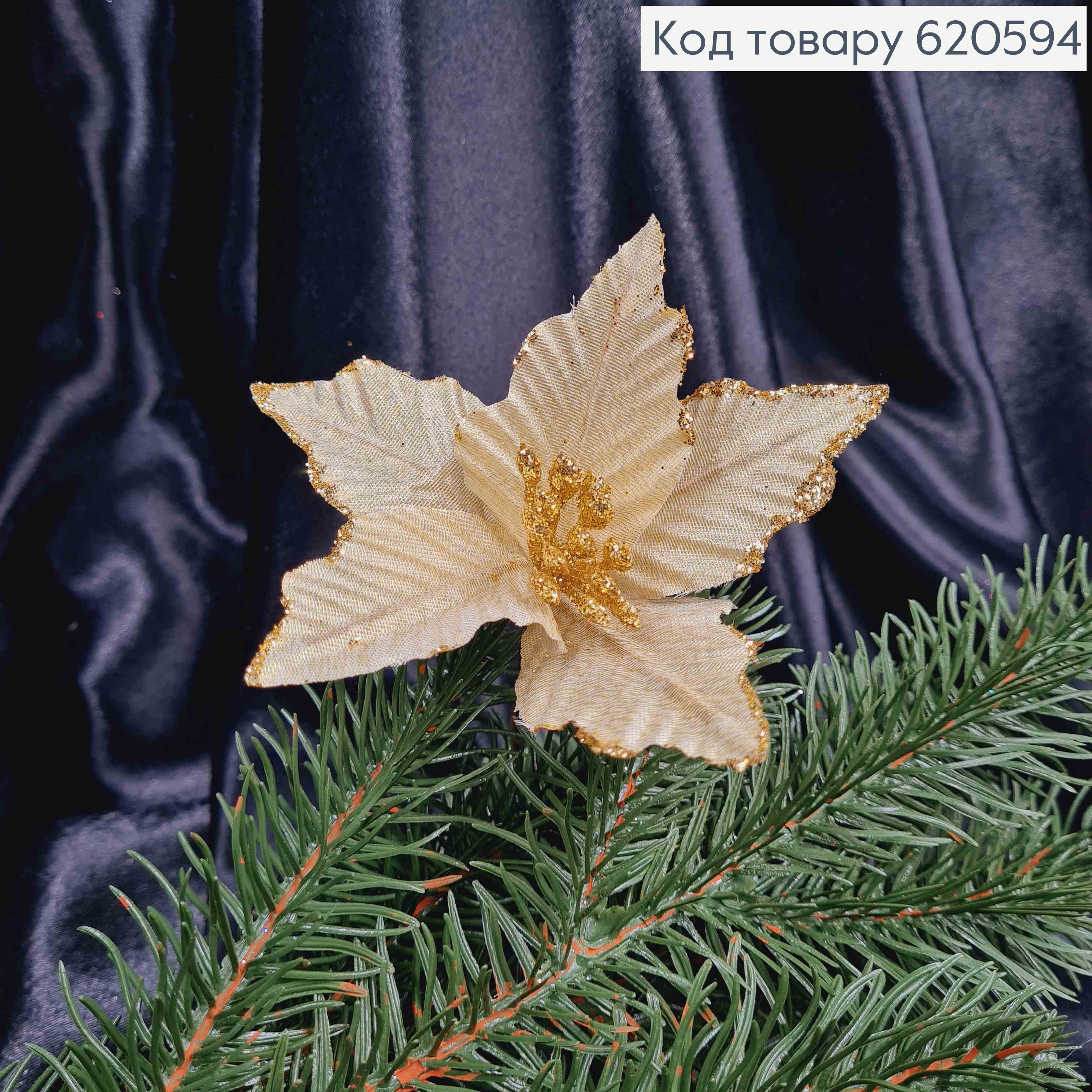 "Рождественник", цветок Пуансетия ЗОЛОТАЯ+БЛЕСК, бархатная, диам. 20см на металл., дл.22см 620767 фото