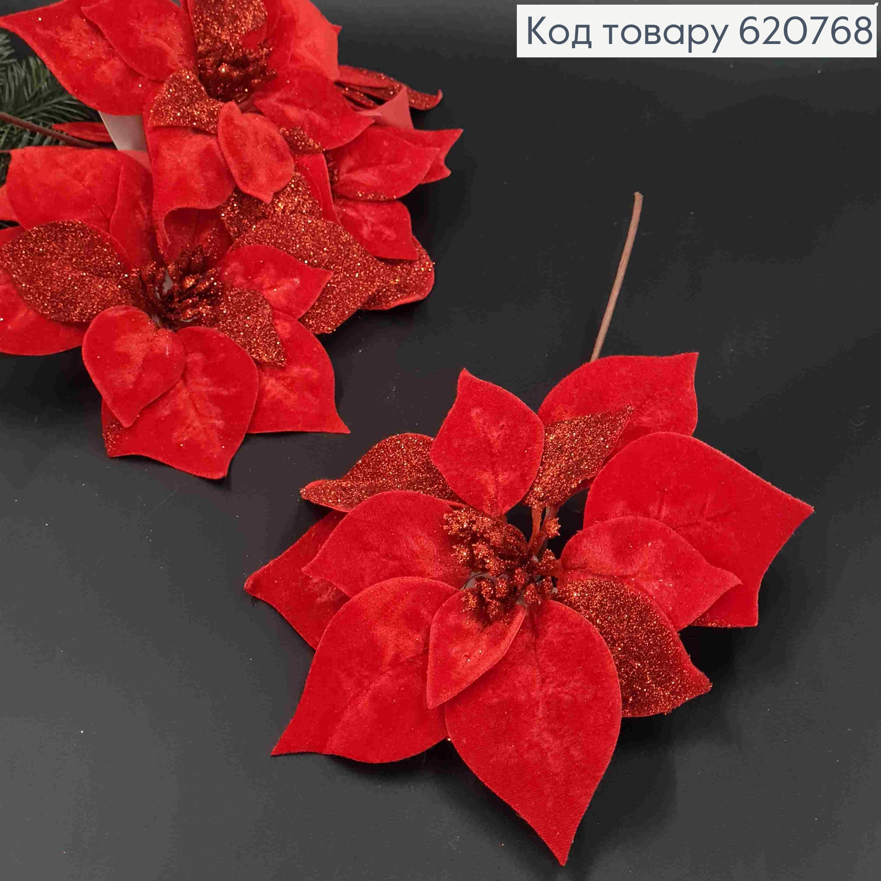 "Рождественник", цветок Пуансетия КРАСНАЯ+БЛЕСК, бархатная, диам. 20см на металл., дл.22см