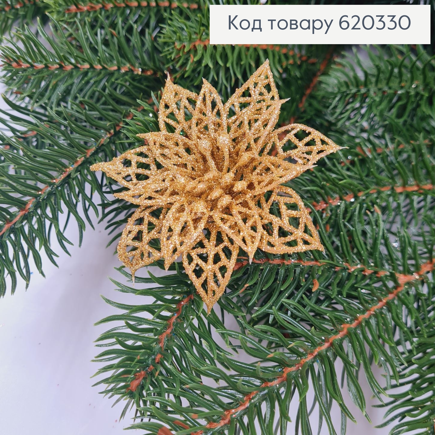 "Рождественник", цветок Пуансетия ЗОЛОТАЯ+БЛЕСК, бархатная, диам. 20см на металл., дл.22см 620767 фото