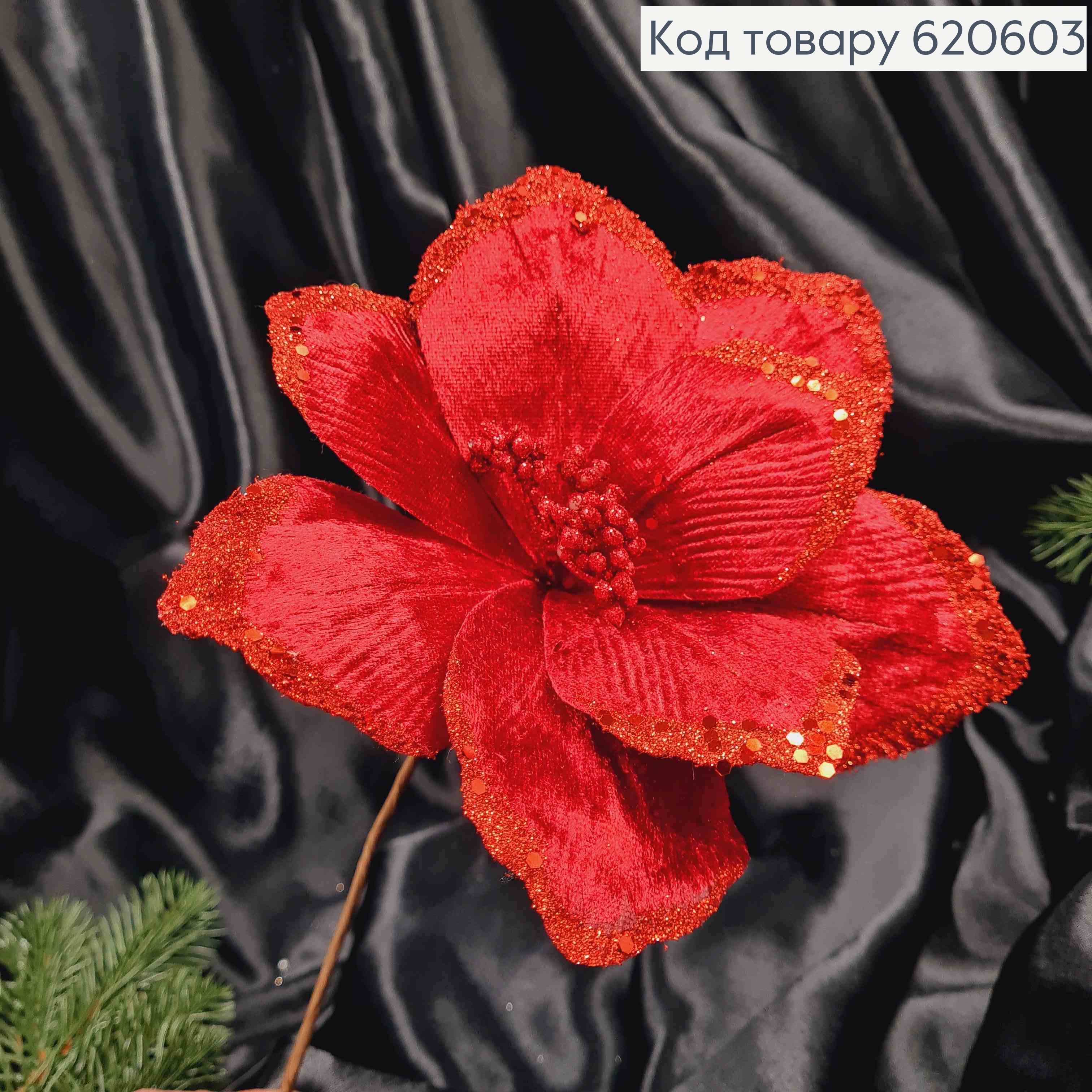 "Рождественник", цветок Пуансетия КРАСНАЯ+БЛЕСК, бархатная, диам. 20см на металл., дл.22см 620768 фото