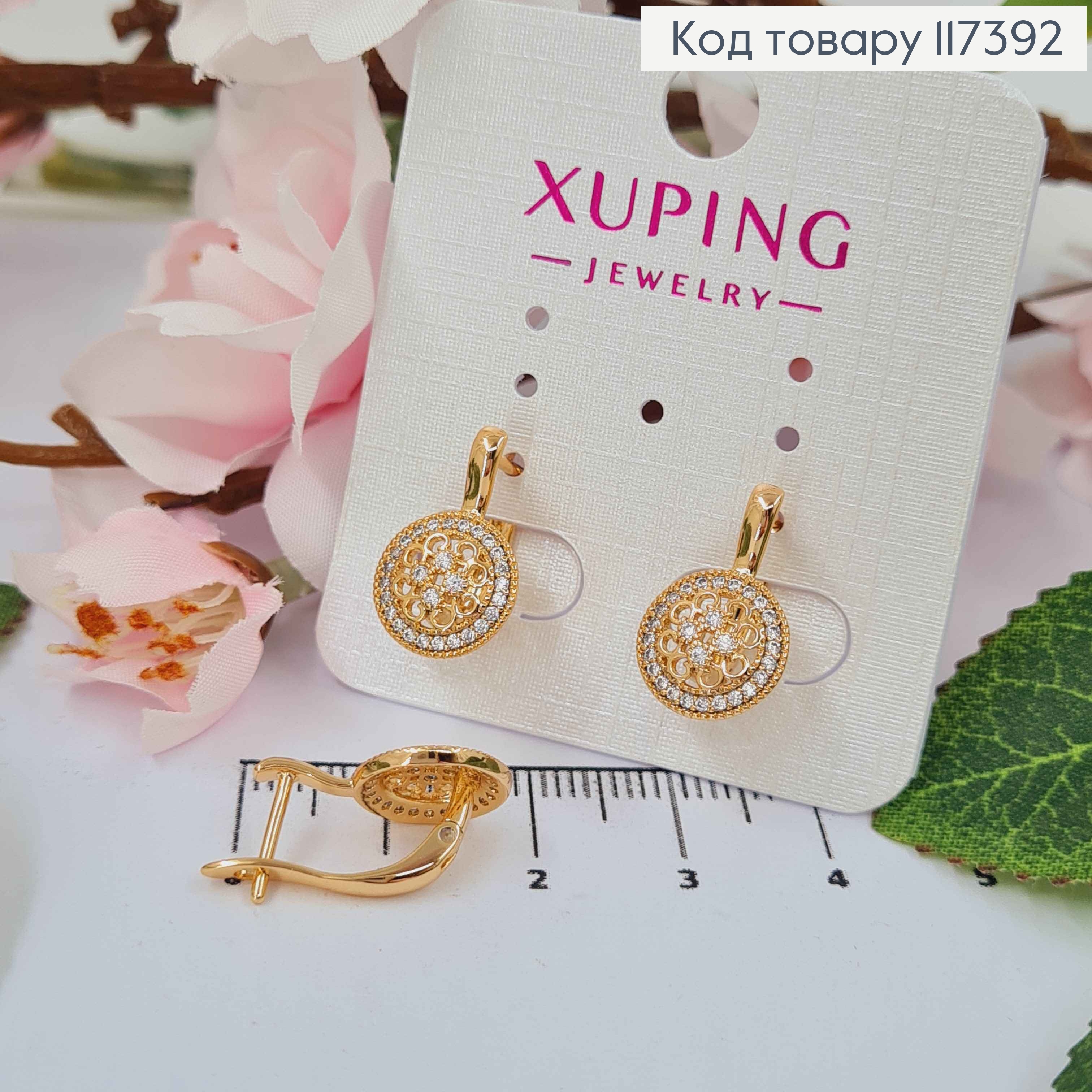 Серьги "Желание", круглая ажурная пластинка в камешках, длина 1,7см, англ застежка, XUPING 18K