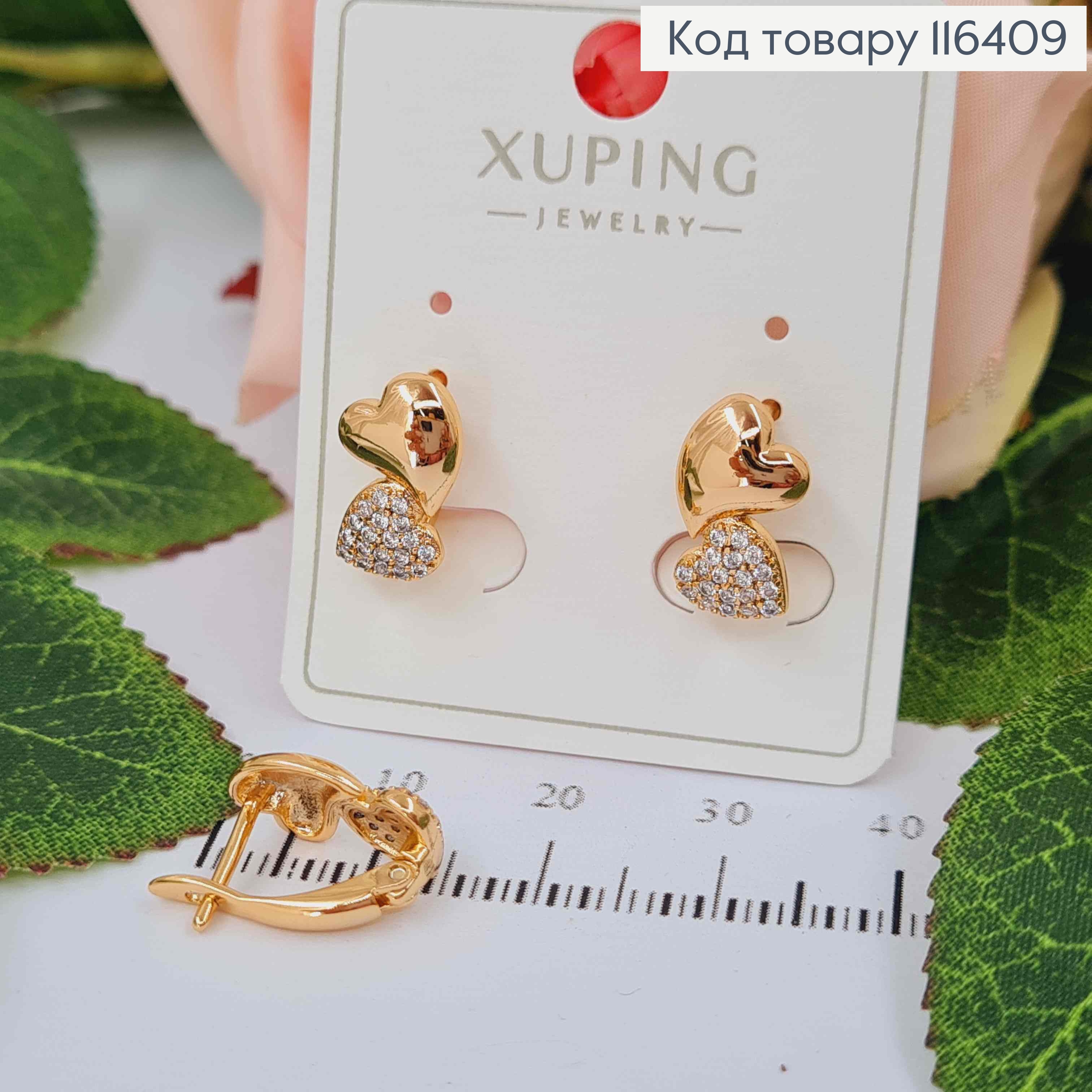Серьги "Два сердечка" в камешках, 1,5см, Xuping 18K