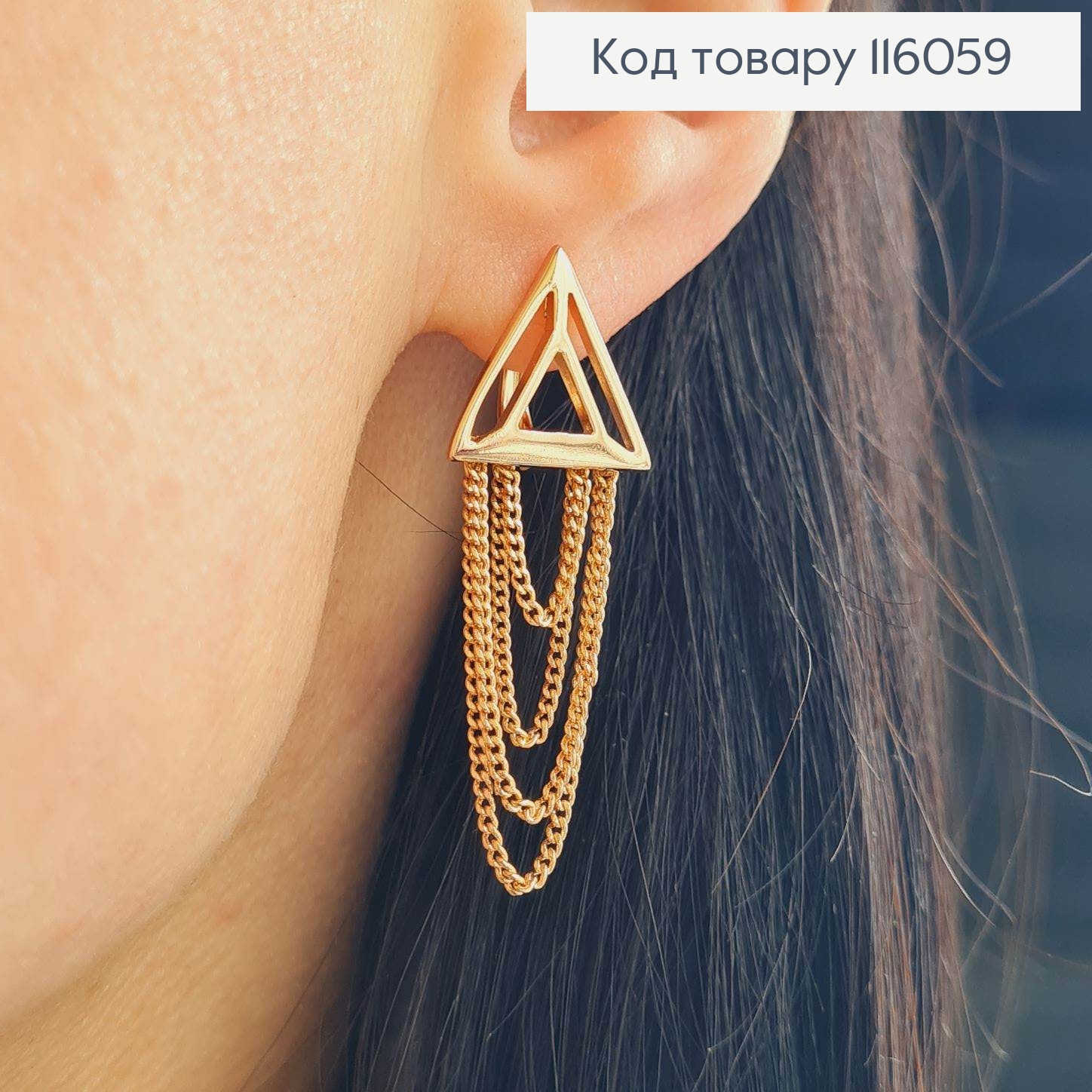 Серьги Графические треугольнички 1,5см, с подвесками цепочками 2,5см, англ. зам. Xuping 18K