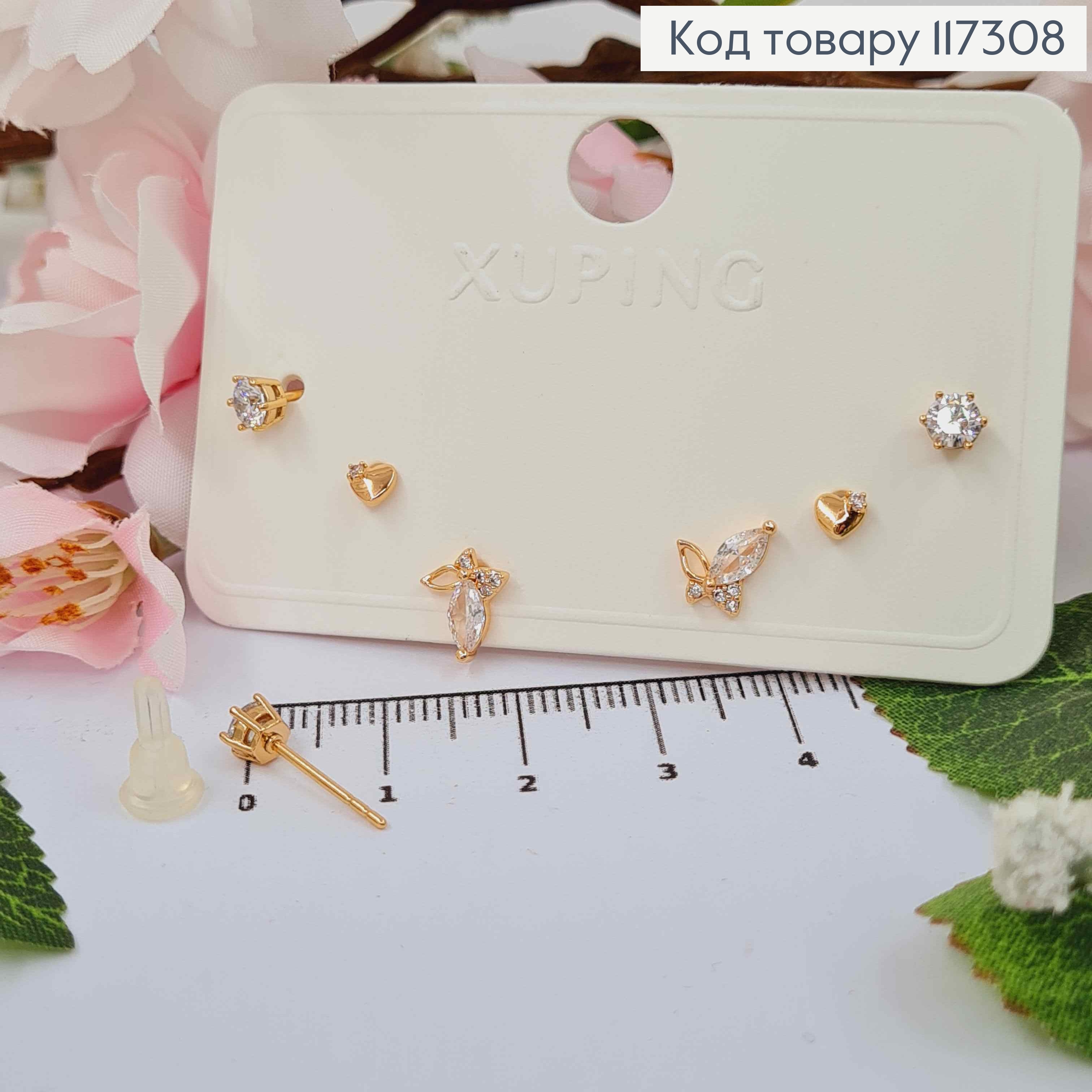 Серьги гвоздики набор (3п), Бабочки и сердце в камнях (7мм, 5мм, 4мм), Xuping 18К