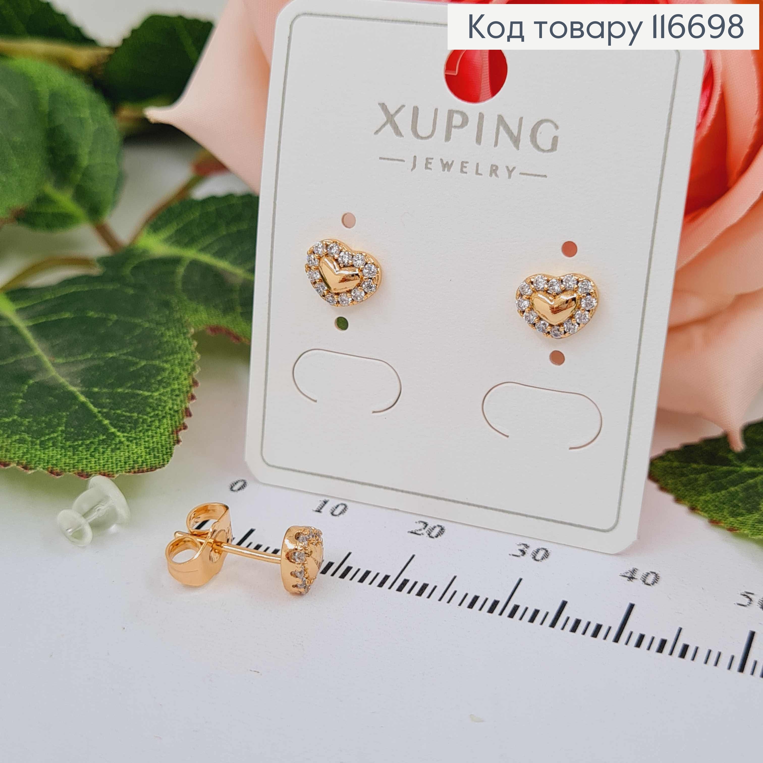 Серьги гвоздики, двойное сердечко, с камешками, 7мм, Xuping 18К