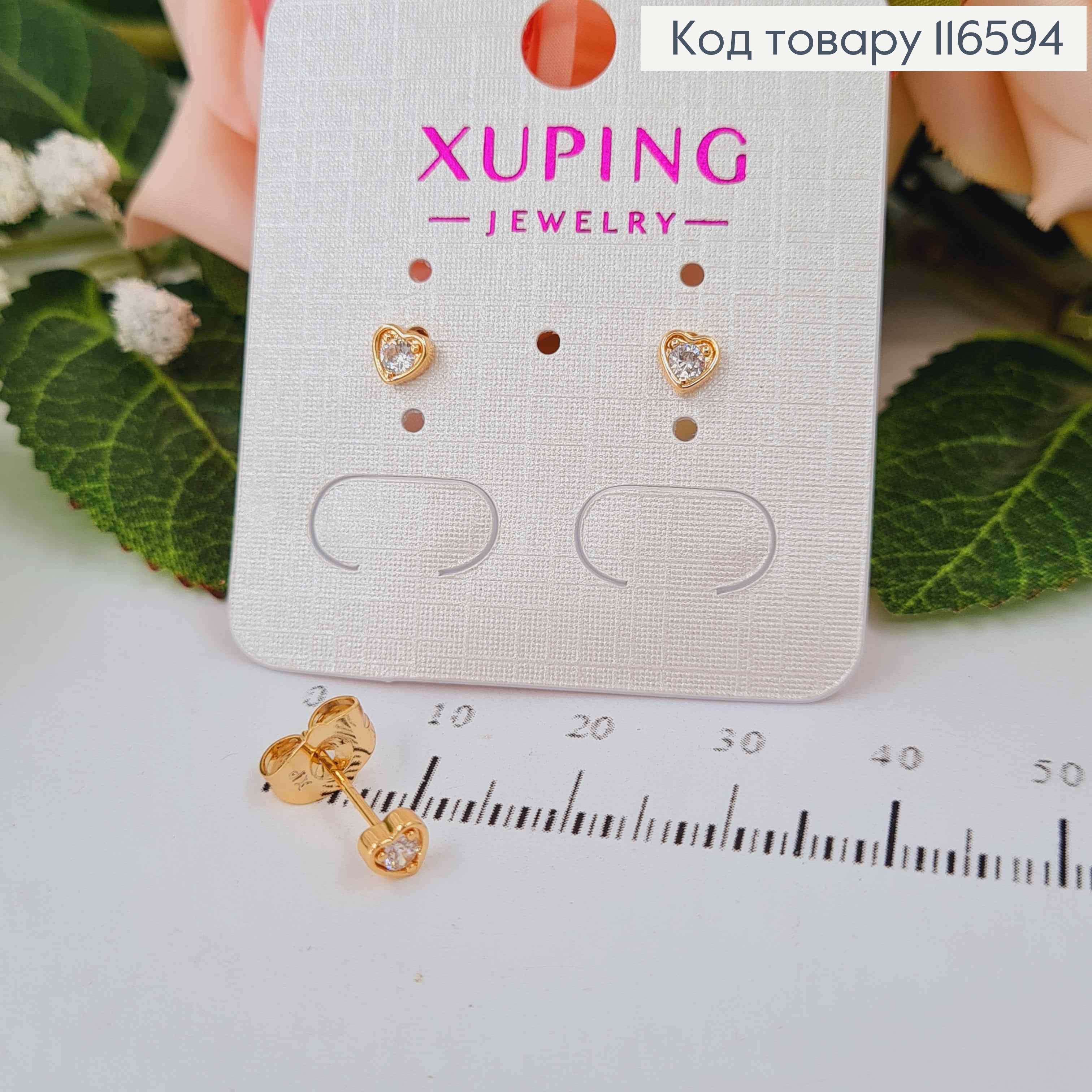 Серьги гвоздики, сердечко с камешком, 0,4см, Xuping 18К