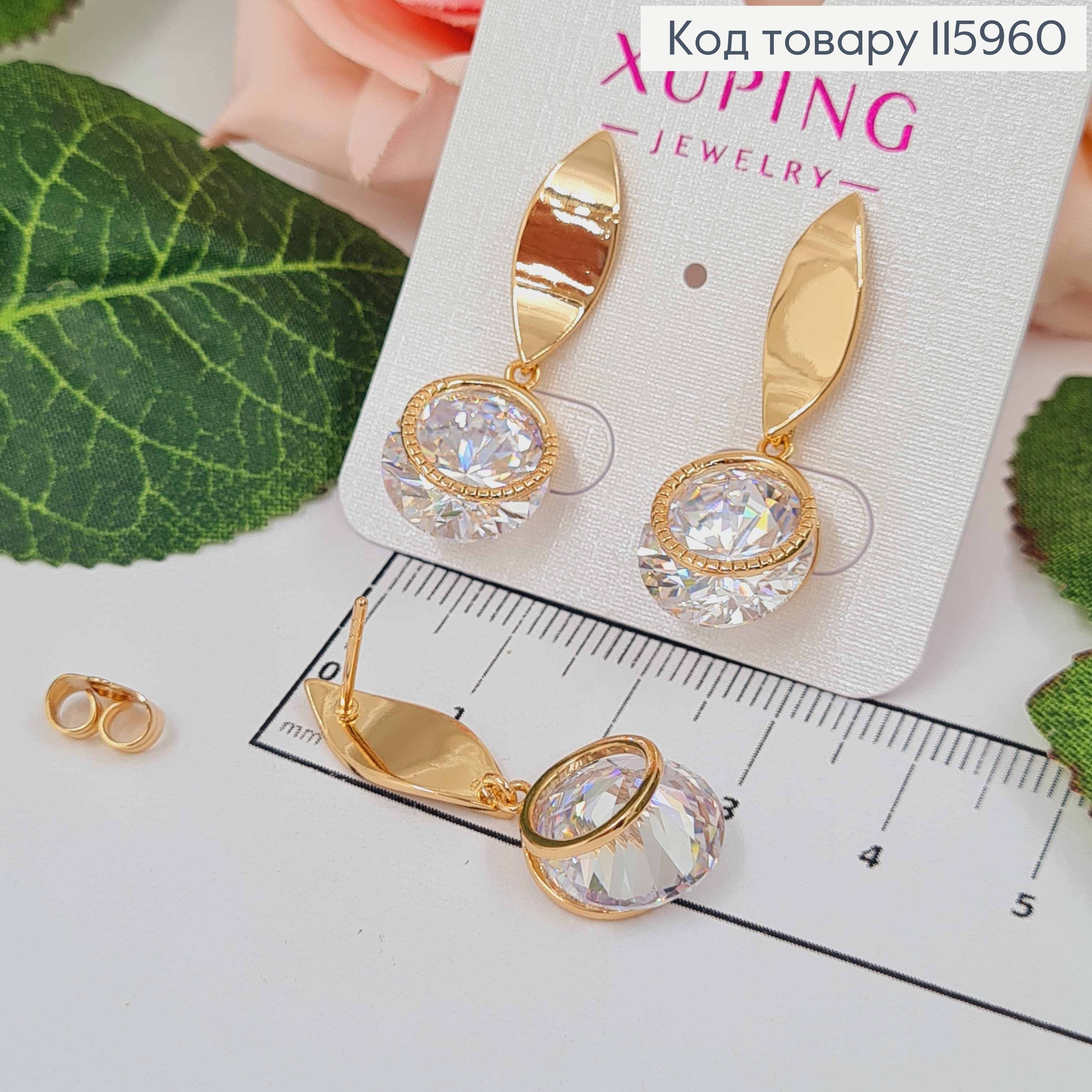 Серьги гвоздики, с лепестком и большим камешком с крученым колечком, 3см, Xuping 18K