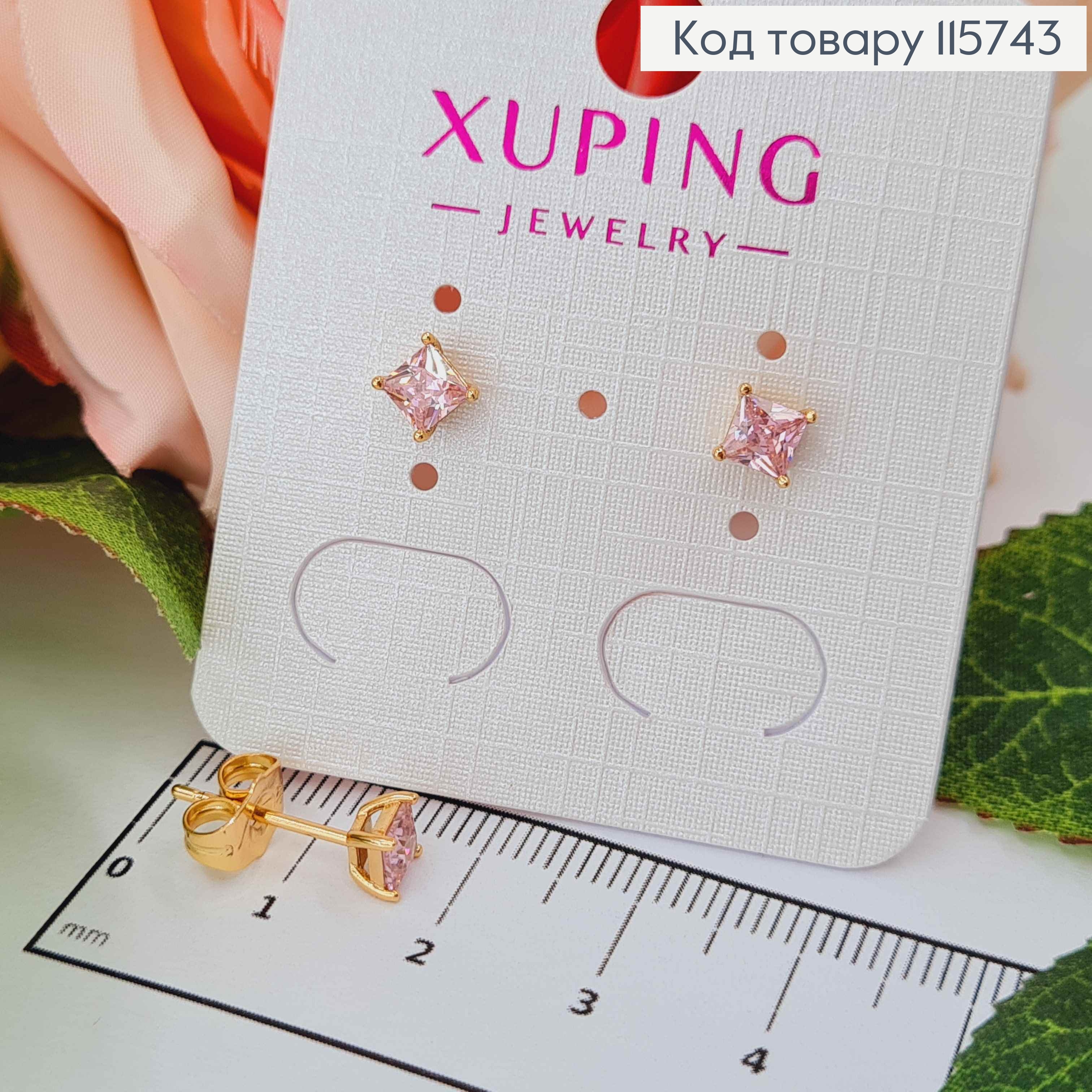 Серьги гвоздики, с РОЗОВЫМ квадратным камнем, 4мм. Xuping 18K