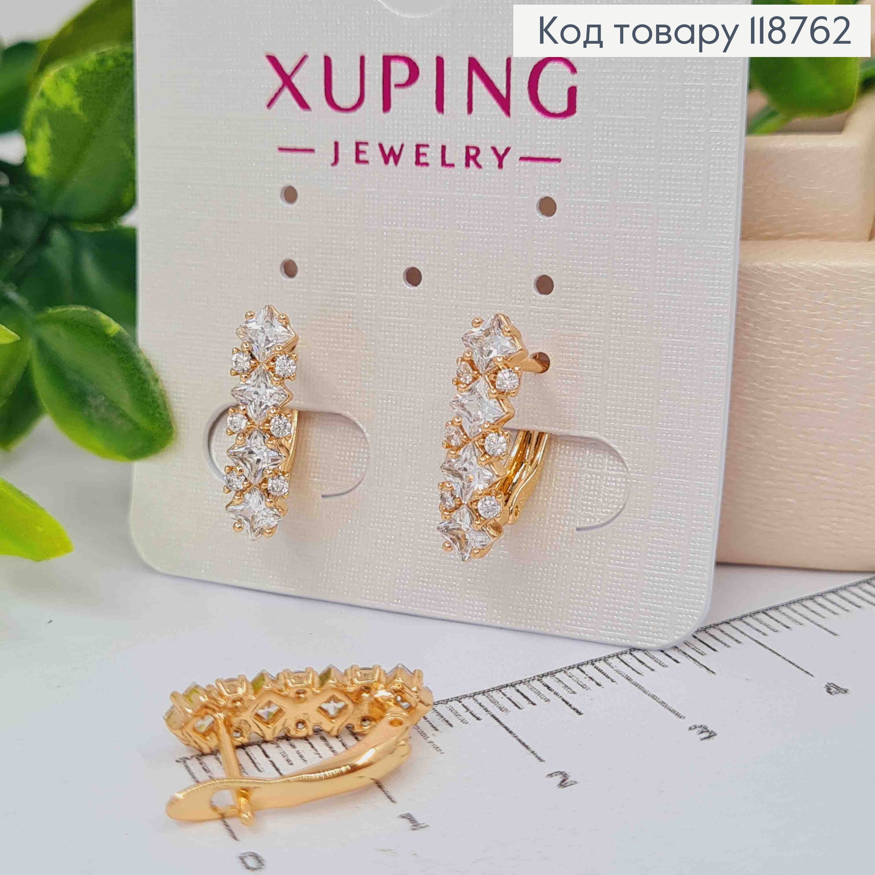 Серьги кольца "Прямоугольные" украшены Блестящими камешками, длиной 2,4см, застежка заколка, Xuping 18К 110199 фото