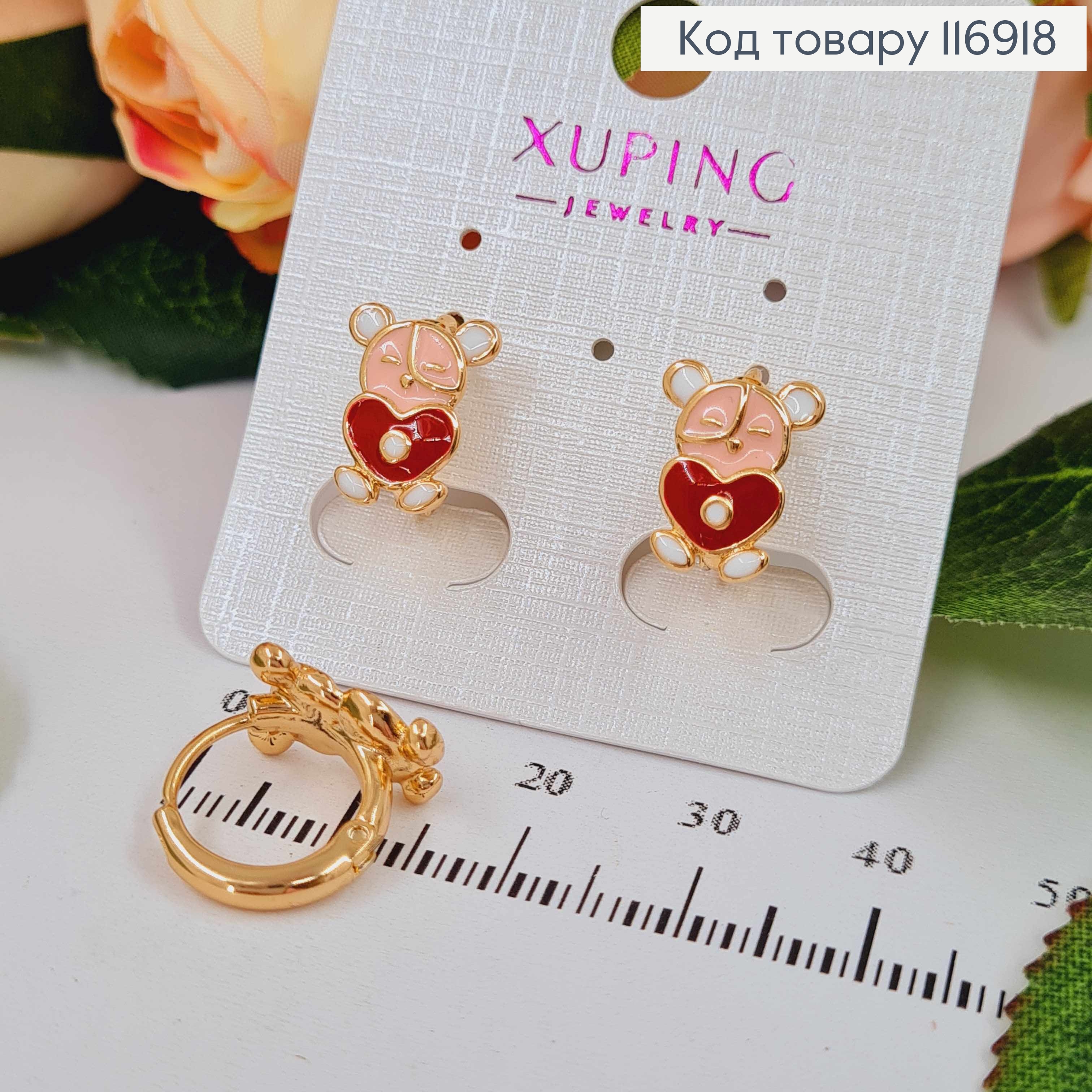 Серьги кольца 1,1см, Мишка с сердечком, с цветной эмалью, 1,3см, Xuping 18K