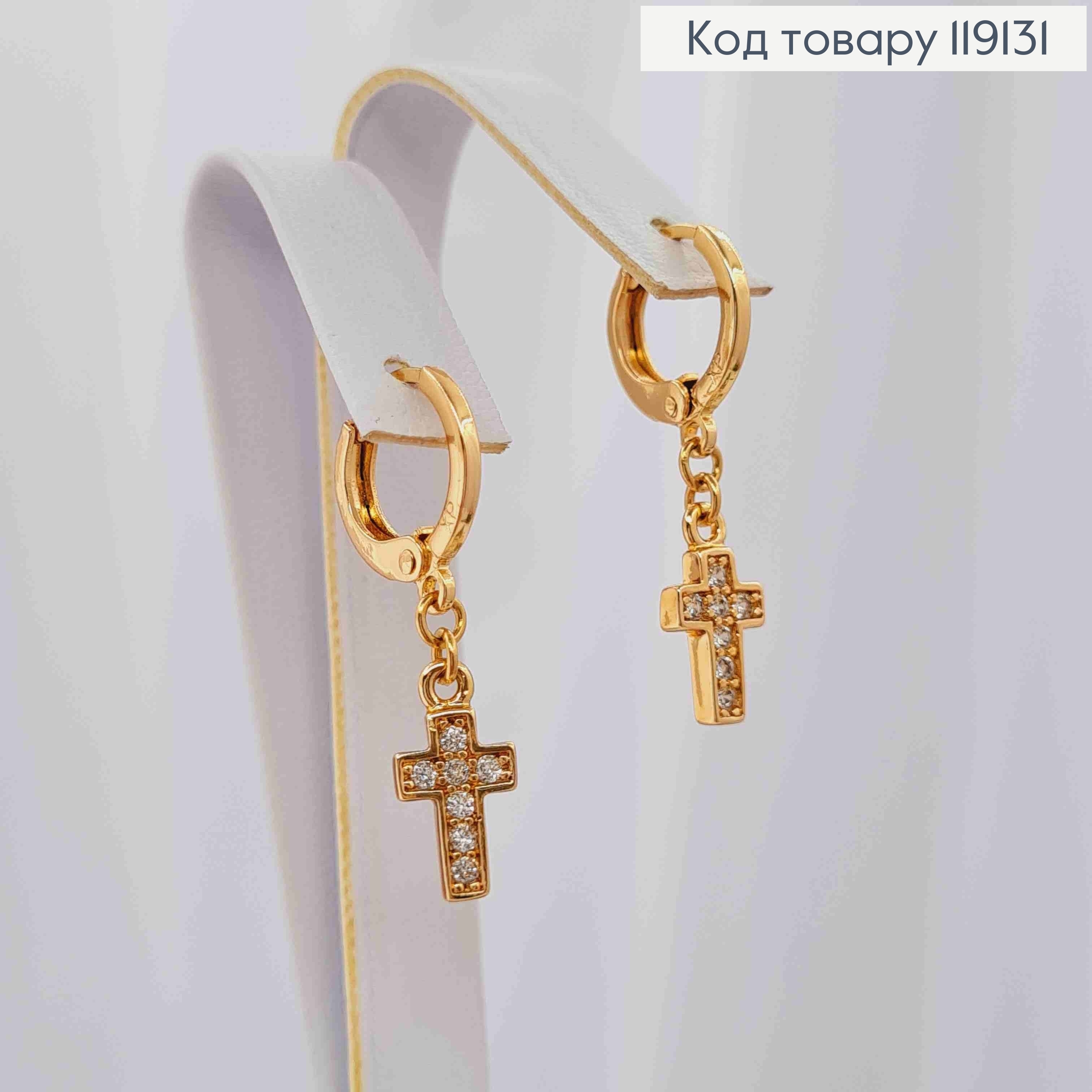Серьги кольца (1,1см) с подвесным крестом в блестящих камнях (1,2*0,6см), XUPING 18K