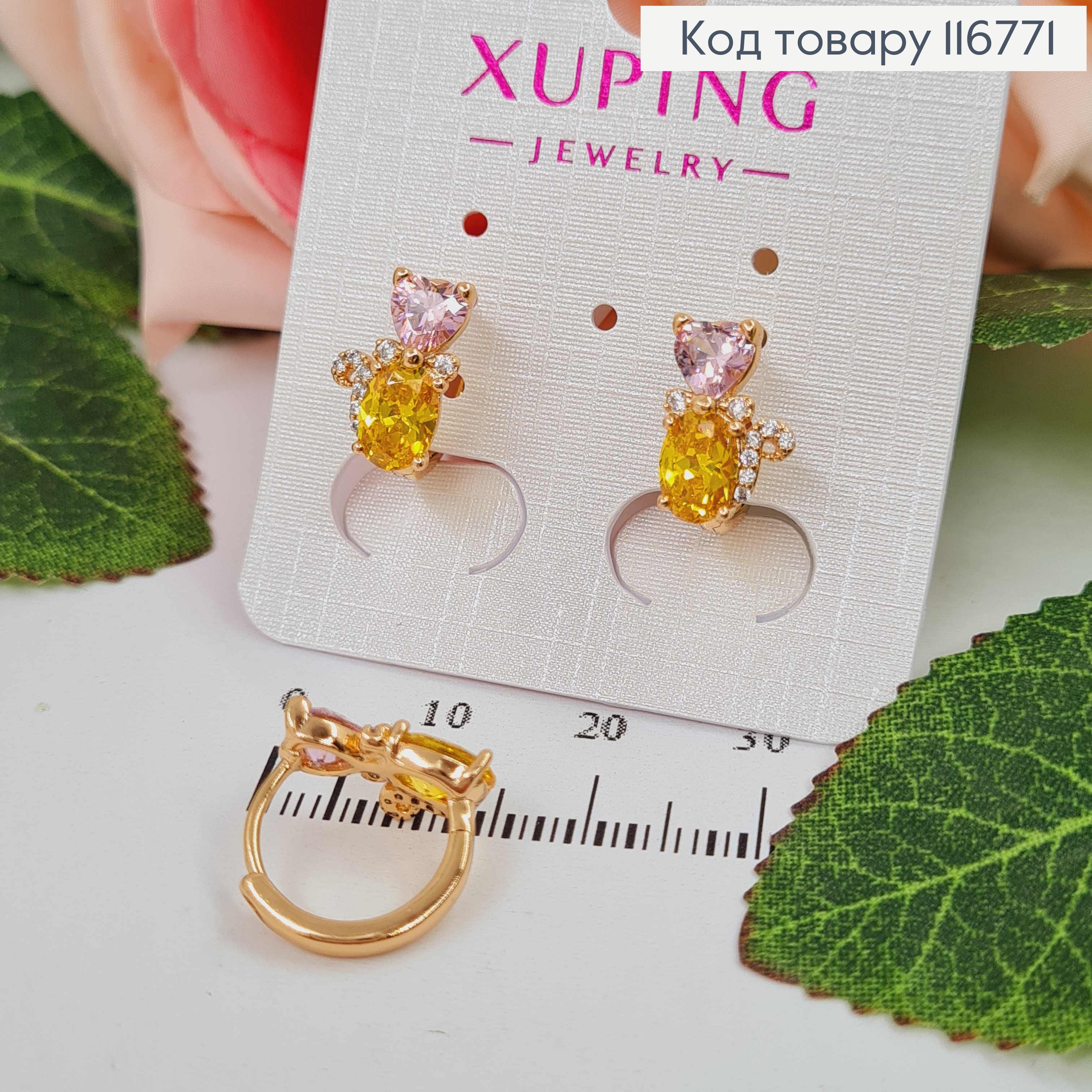 Серьги кольца 1,2см, Кошка с розовыми и желтыми камешками, 1,3см, Xuping 18K