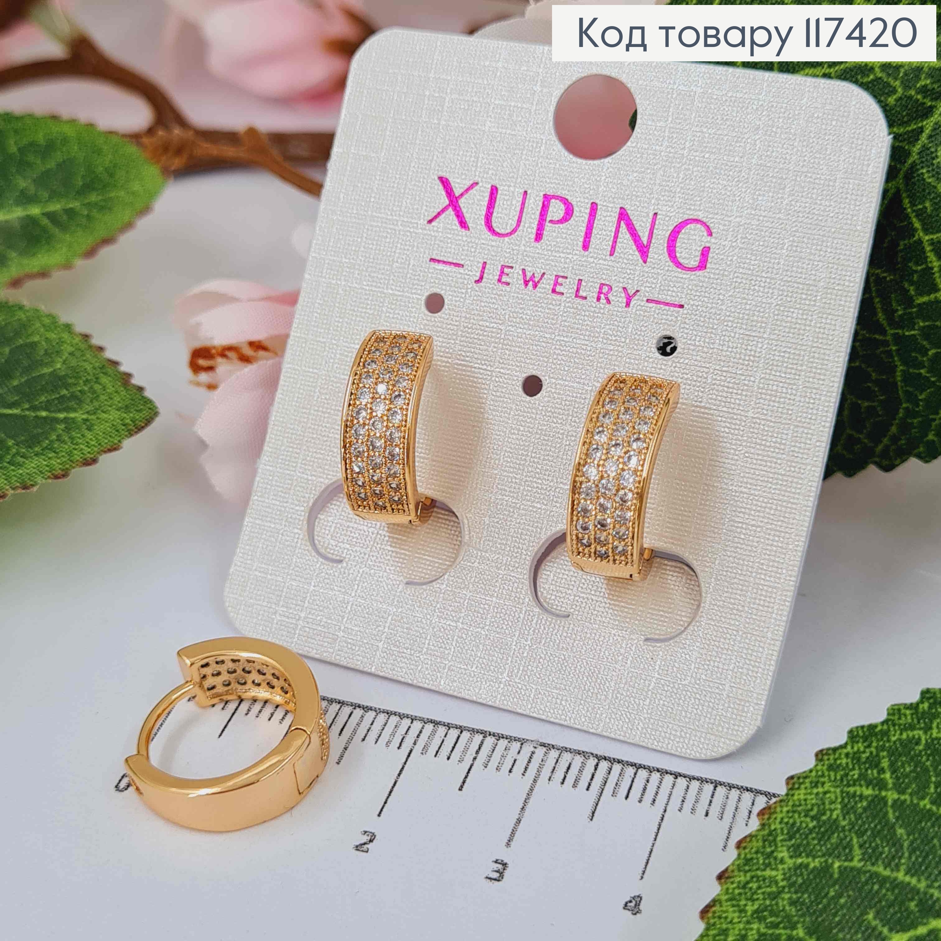 Серьги кольца 1,5см, Широкие украшены в три ряда камешками, ширина 6мм, XUPING 18K