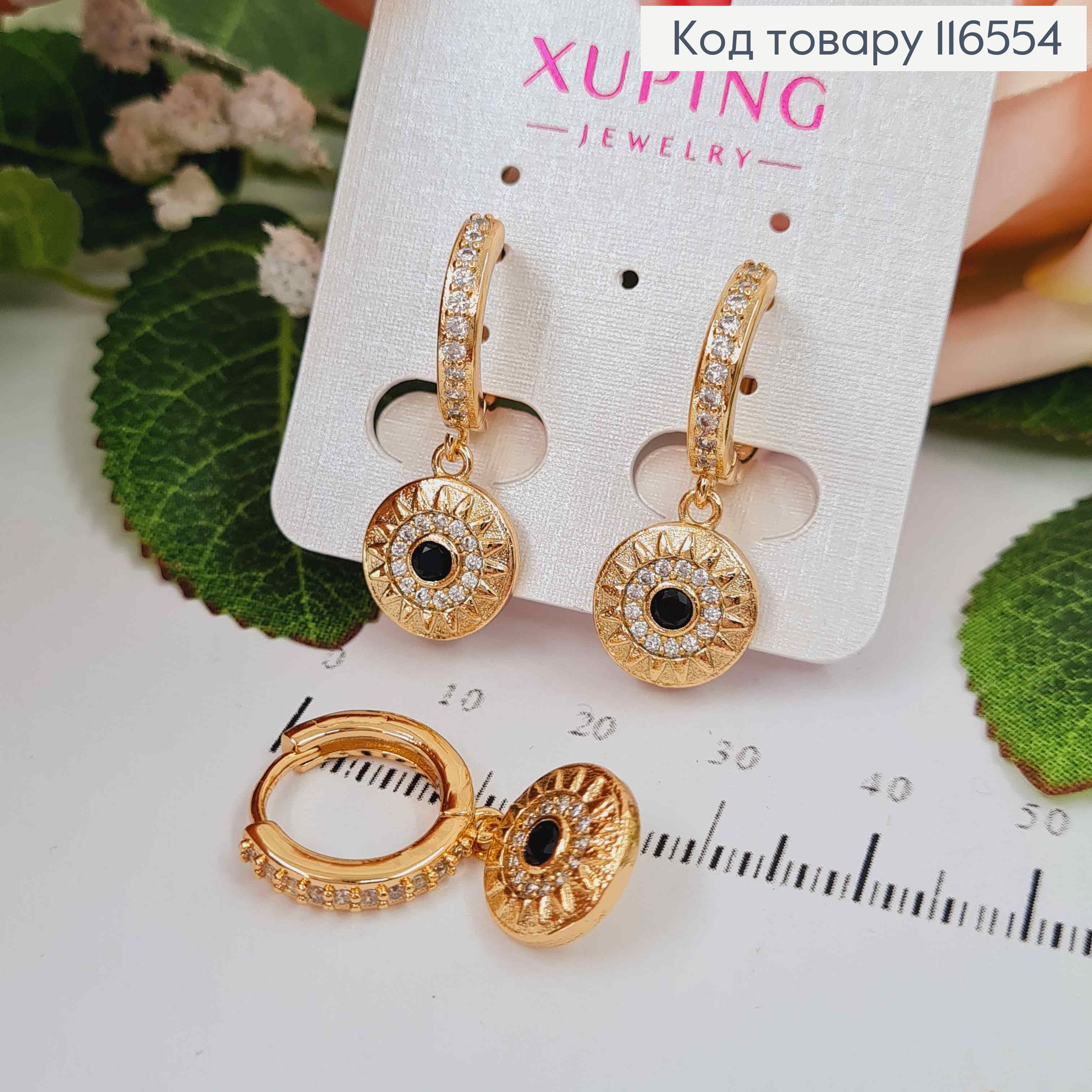 Серьги кольца 1,5см, с подвеской в греческом стиле с черной эмалькой, в камешках, 1,2см, Xuping 18K