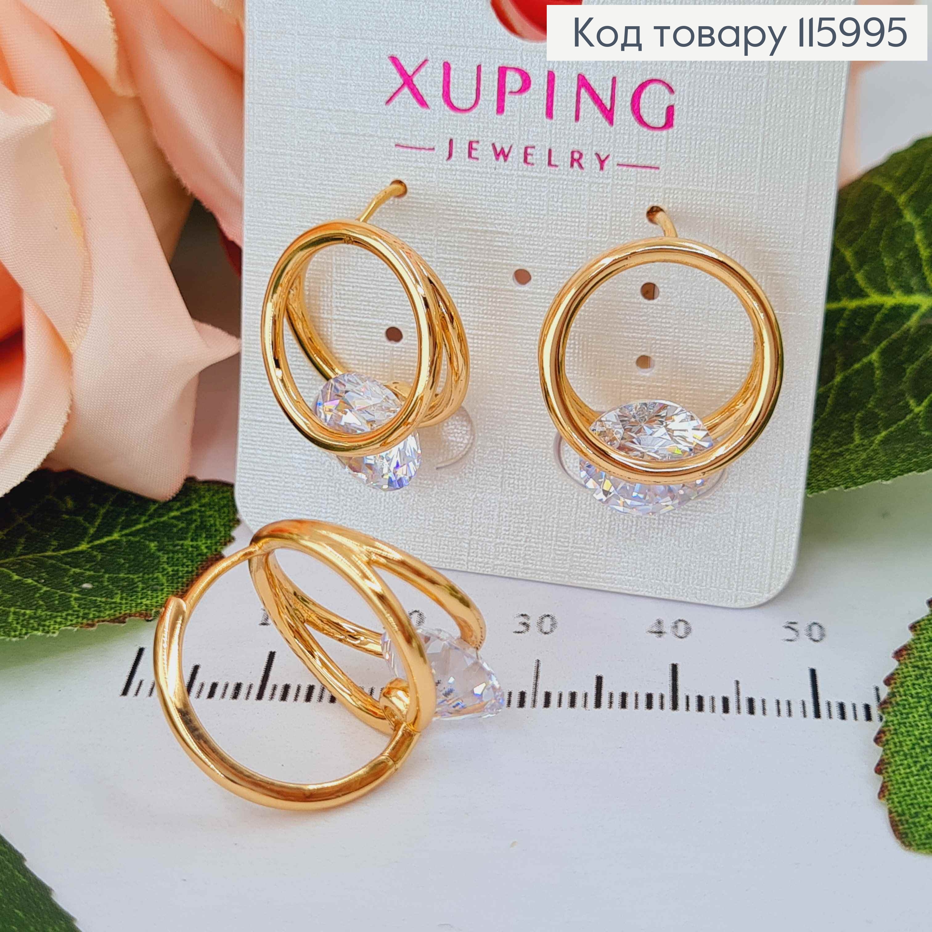 Серьги кольца 1,6см, "Три колечка" с камешком, англ. застежка, Xuping 18K
