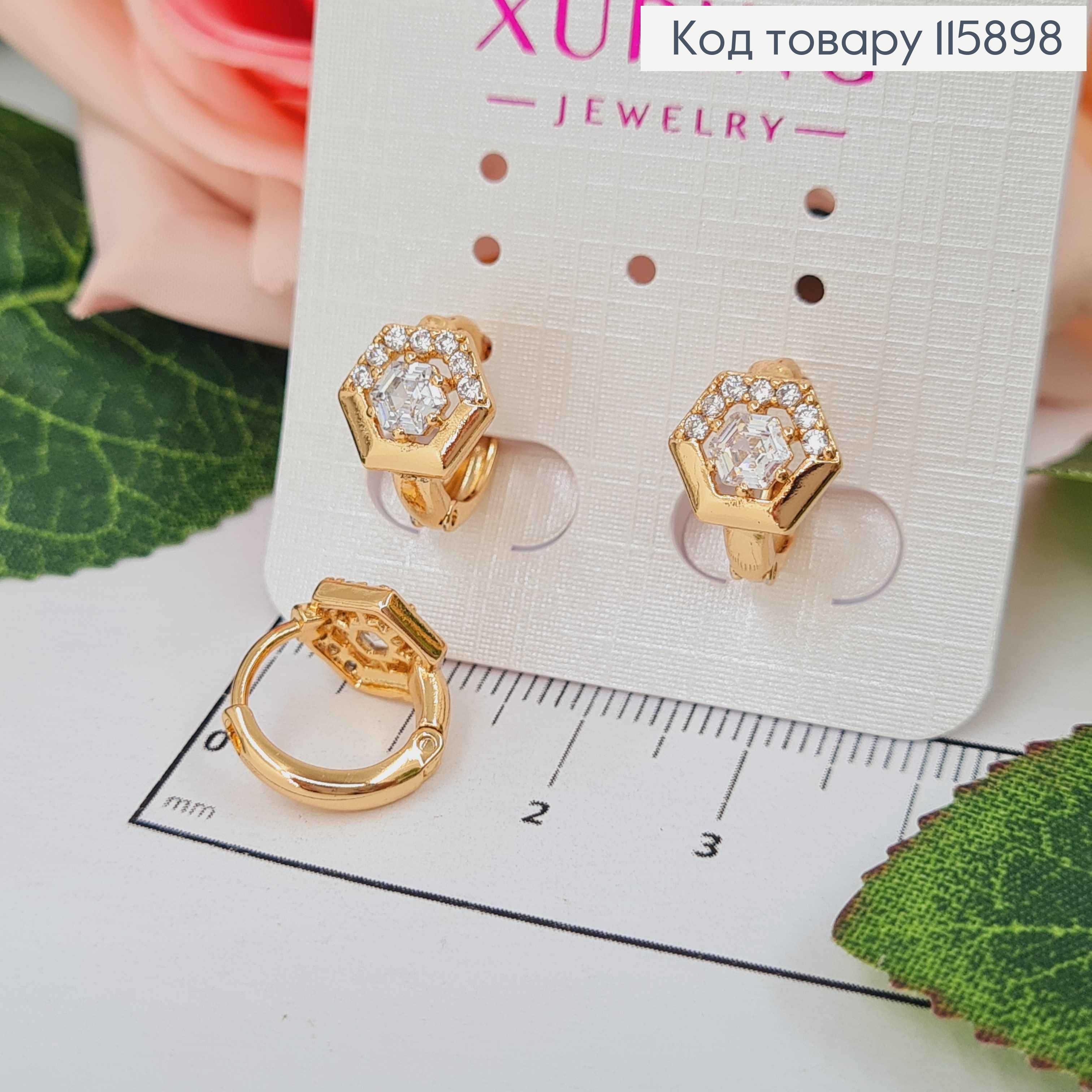 Серьги кольца 1см, Шестигранник с камешком, Xuping 18K