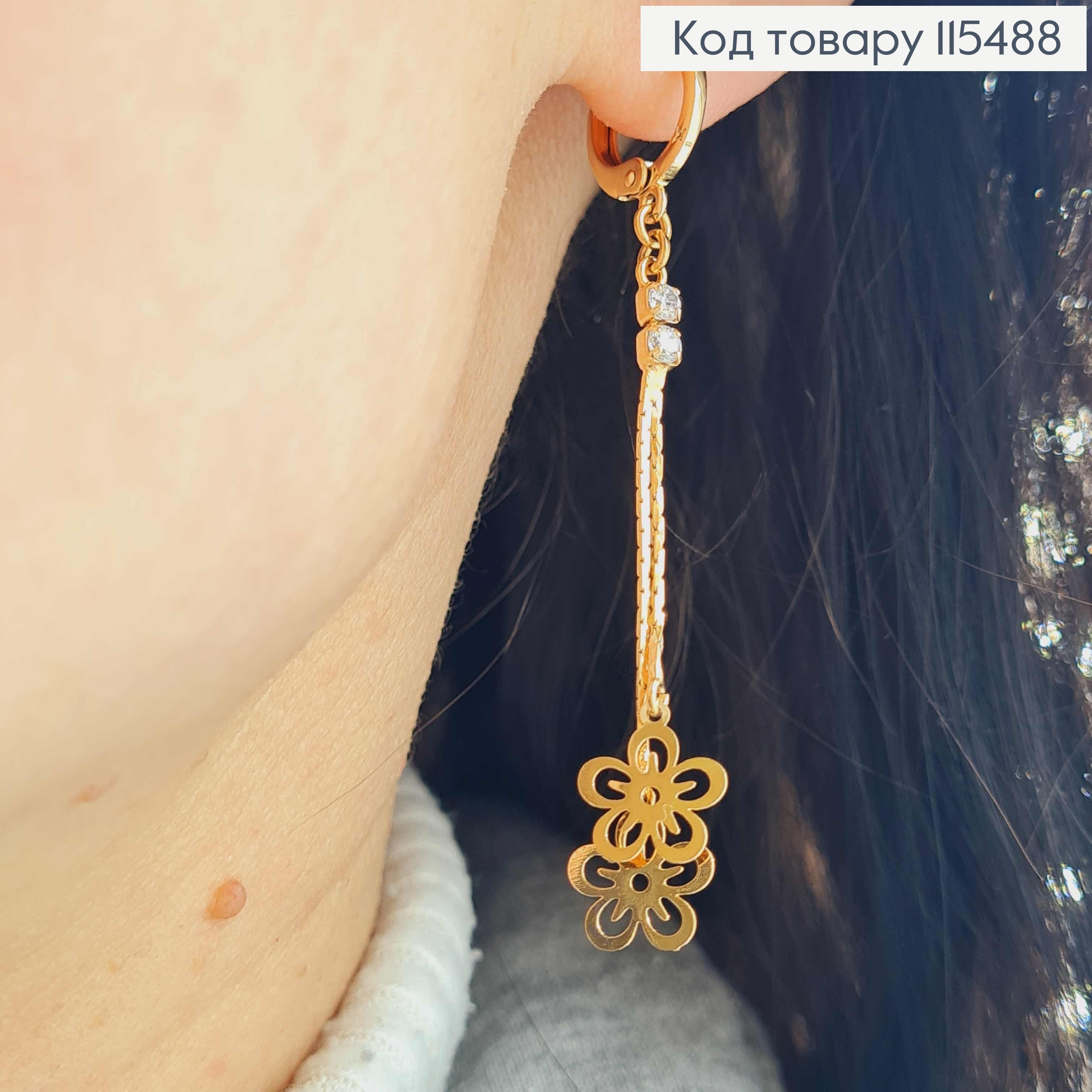 Серьги кольца 1см, с камешками и подвеской ниточками с цветами 4см Xuping 18K