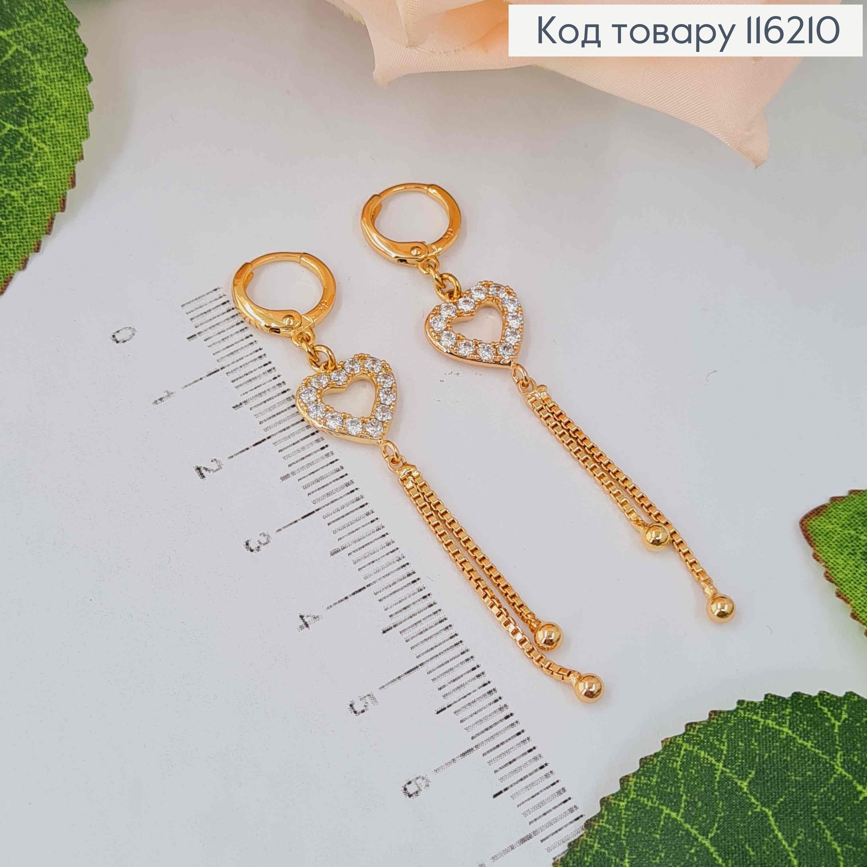 Серьги кольца 1см, с подвесками 5см, Сердечками в камнях и ниточками с шариком, Xuping 18K