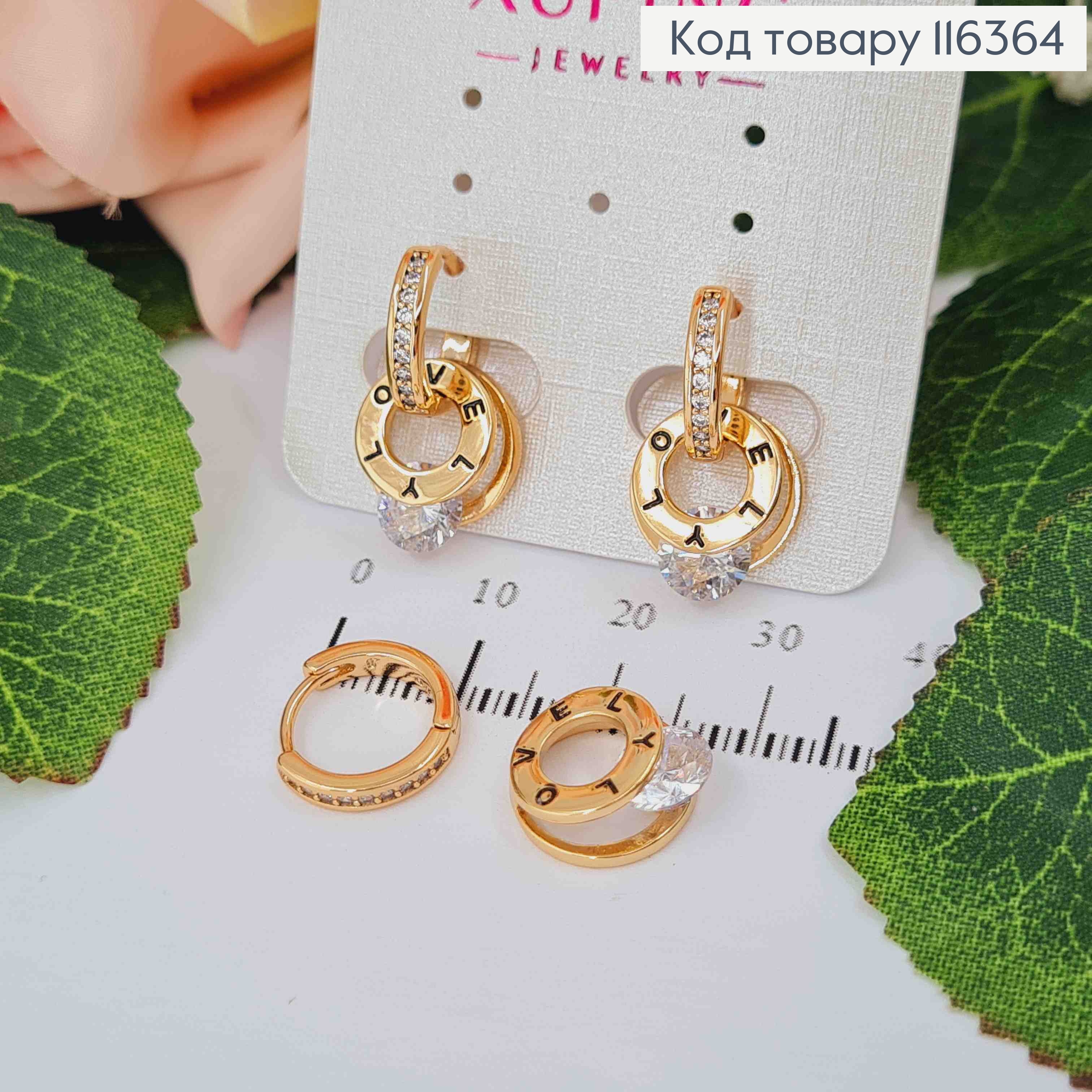Серьги кольца, 1см, с подвеской "Lovely" с камешком, Xuping 18K